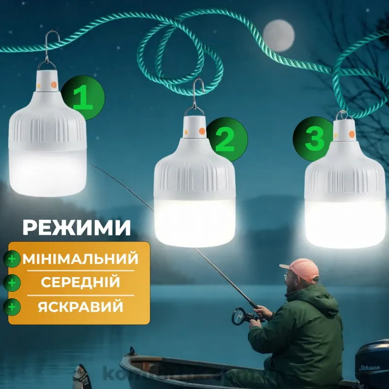 Кемпінгова лампа - яскраве та надійне освітлення для кемпінгу, риболовлі й дому. Потужне світло, автономна робота без мережі, компактний формат і зручне кріплення. Працює доволі довго, заряджається швидко, виручає в будь-яких умовах. Чудове рішення в ситуаціях вимкнення світла або коли немає доступу до електромережі. На максимальній яскравості лампа тримає приблизно 1-1.5 год. На середньому або низькому 2-3 годи. Заряджається через USB провід.