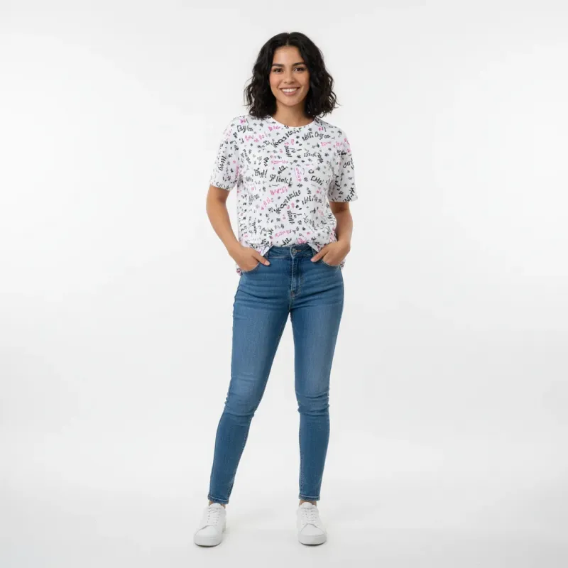 Додай у свій гардероб елемент самовираження та сучасного стилю з нашою новою **білою жіночою футболкою, прикрашеною оригінальним принтом із словами та символами**. Ця футболка – ідеальний вибір для тих, хто любить виділятися та висловлювати свою індивідуальність через одяг. Динамічний візерунок з написів "Hello!", "Bye", "Fashion", "Cool", "Hi", "yes", "oops", доповнений хештегами та зірочками, виконаний у чорному та яскравому рожевому кольорах, створює привабливий та молодіжний вигляд.