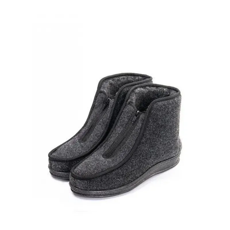Зручні та дуже теплі чоловічі бурки (чуні) на блискавці — це ідеальний варіант зимового взуття для дому, дачі або роботи в прохолодних приміщеннях. Модель виконана в класичному стилі та розрахована на чоловіків, які передусім цінують комфорт і тепло. Верх виготовлений із щільного сірого сукна (повсті), яке має відмінні теплоізоляційні властивості, але при цьому дозволяє ногам "дихати". Головна перевага моделі — застібка-блискавка спереду. Це максимально спрощує процес взування, що особливо важливо для літніх людей або тих, хто має високий підйом ноги. Всередині бурки утеплені густим штучним хутром. Підошва виготовлена з ПВХ, вона легка, не промерзає і має рифлення для захисту від ковзання. Характеристики: Сезон: Зима / Холодна осінь Матеріал верху: Повсть (сукно) Матеріал підкладки: Штучне хутро Застібка: Блискавка спереду (змійка) Колір: Темно-сірий Підошва: ПВХ (лита) Розміри в наявності: 41, 42, 43, 44, 45, 46