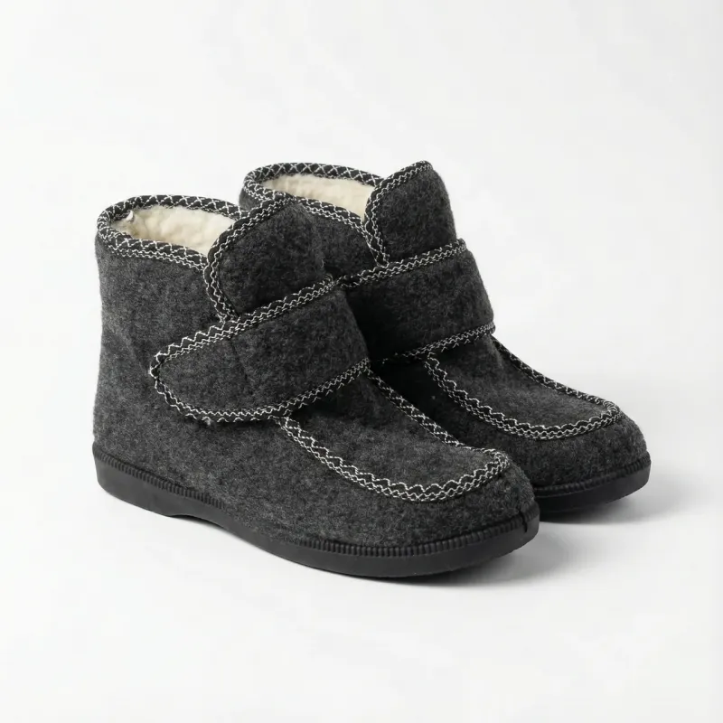 Зручні та теплі суконні бурки (чуні) із регульованою застібкою — найкращий вибір для людей, які цінують комфорт або мають особливості стопи. Головна перевага цієї моделі — широкий вхід та застібка-липучка, яка дозволяє ідеально підлаштувати взуття під будь-який підйом та повноту ноги (незамінні при набряках). Верх виготовлений із міцного темно-сірого сукна (повсті), яке добре зберігає тепло та дозволяє нозі «дихати». Декоративна світла строчка додає взуттю охайного вигляду. Всередині бурки утеплені густим світлим штучним хутром, що забезпечує тепло навіть у холодних приміщеннях. Підошва виготовлена з ПВХ, вона легка, гнучка та не ковзає. Таке взуття чудово підійде як для постійного носіння в будинку, так і для виходу на подвір'я. Характеристики: Сезон: Зима / Холодна осінь Матеріал верху: Сукно (щільна повсть) Матеріал підкладки: Штучне хутро (світле) Застібка: Липучка (регулювання повноти) Особливості: Підходять на широку ногу та високий підйом Підошва: ПВХ (лита, чорна) Країна виробник: Україна Розміри в наявності: 37, 38, 39, 40, 41, 42