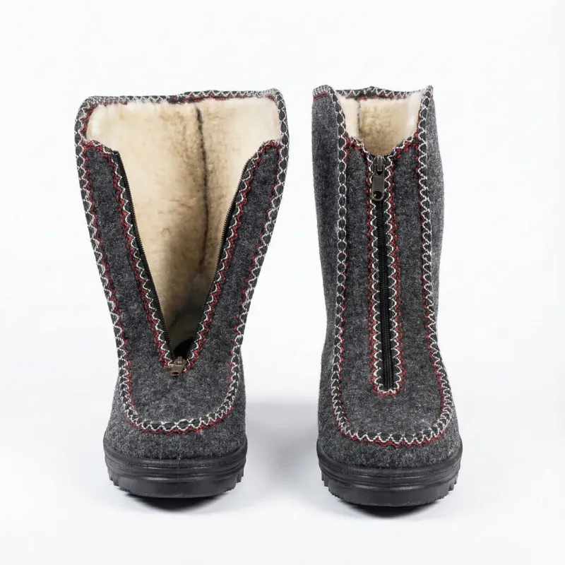 Зимові суконні бурки (чуні) з регульованою застібкою — це ідеальне рішення для тих, хто шукає максимальний комфорт та простоту взування. Ця модель розроблена спеціально з урахуванням потреб людей із широкою стопою, високим підйомом або набряками. Верх виконаний із щільного взуттєвого сукна (повсті) темно-сірого кольору, яке чудово зберігає тепло, але при цьому забезпечує вентиляцію стопи. Головна особливість моделі — широка застібка-липучка, яка дозволяє легко регулювати об'єм взуття під індивідуальні особливості ноги. Всередині бурки утеплені густим штучним хутром (світла овчина), що гарантує тепло навіть у сильні холоди. Підошва виготовлена з ПВХ — вона легка, не обтяжує ногу, не дубіє на морозі та має рельєфний протектор проти ковзання. Характеристики: Сезон: Зима / Холодна осінь Матеріал верху: Сукно (щільна повсть) Матеріал підкладки: Штучне хутро (дуже тепле) Застібка: Липучка (регулювання повноти та підйому) Колір: Темно-сірий (графіт) Підошва: ПВХ (лита, зносостійка) Країна виробник: Україна Розміри в наявності: 38, 39, 40, 41, 42