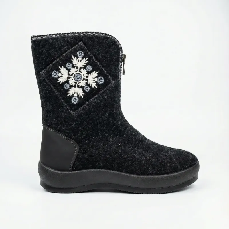 Елегантні та надійні високі бурки, які поєднують комфорт домашнього взуття та міцність вуличних чобіт. Ця модель — ідеальний вибір для морозної зими. Висока халява надійно захищає ногу від холоду, а акуратний дизайн дозволяє носити їх як у приватному будинку, так і на вулиці. Верх виготовлений із якісної щільної повсті чорного кольору. З зовнішнього боку модель прикрашена красивою вишивкою «Сніжинка», що надає їй зимового шарму. Дуже важлива деталь — посилена п'ята (вставка з еко-шкіри), яка захищає взуття від промокання та деформації в найуразливішому місці. Для зручності взування передбачена застібка-блискавка збоку (з внутрішньої сторони). Всередині чоботи утеплені густим штучним хутром. Лита підошва з ПВХ має гарний протектор, не ковзає і забезпечує стійкість на снігу. Характеристики: Сезон: Зима Матеріал верху: Натуральна повсть (сукно) Матеріал підкладки: Густе штучне хутро Застібка: Блискавка збоку (внутрішня сторона) Особливості: Вишивка «Сніжинка», посилена п'ята (задник) Колір: Чорний Підошва: ПВХ (висока, морозостійка) Розміри в наявності: 37, 38, 39, 40, 41