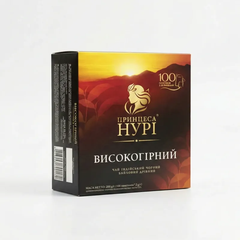 Чай "Принцеса Нурі Високогірний" — це втілення традиційного смаку справжнього чорного чаю. Він виготовлений з чайного листа, зібраного на високогірних плантаціях Індії. Завдяки особливим кліматичним умовам, цей чай має насичений колір, глибокий аромат та приємний терпкий смак. Це ідеальний варіант для щоденного чаювання в колі сім'ї. Він швидко заварюється, дарує бадьорість і чудово смакує з цукром, лимоном або домашньою випічкою. Велика упаковка містить 100 пакетиків з ярличками, що робить її дуже економною та зручною у використанні. Вистачить на довгі вечори душевних розмов!. Характеристики: Бренд: Принцеса Нурі. Тип: Чорний байховий дрібний. Сорт: Високогірний (Highland). Походження: Індія. Фасовка: 100 пакетиків з ярличками. Вага: 200 г (100 х 2 г).