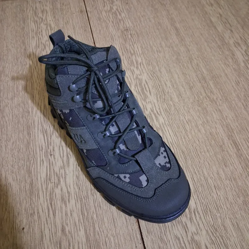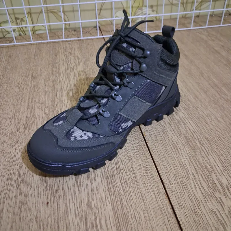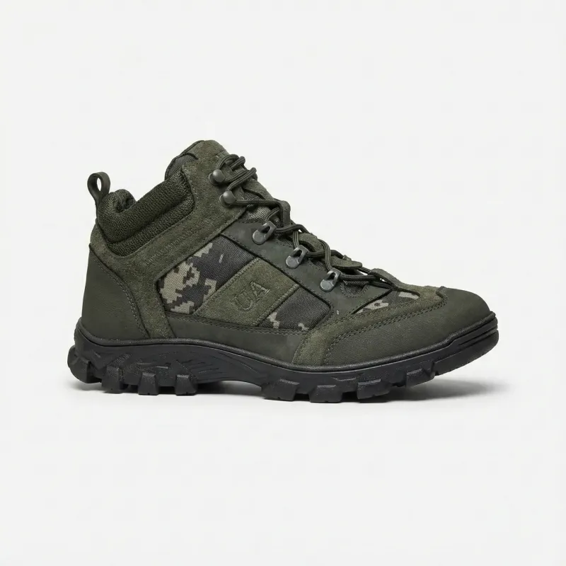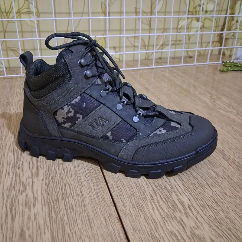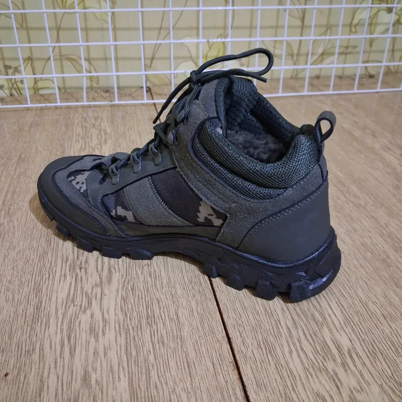 Опис: Надійні та теплі зимові черевики для активного використання, полювання, риболовлі або військових потреб. Модель виконана в комбінованому стилі: міцний нубук захищає від зносу, а вставки з камуфляжної тканини (піксель) забезпечують стильний вигляд та полегшують вагу взуття. Черевики утеплені густим хутром, що гарантує комфорт навіть у сильні морози. Підошва має глибокий протектор, який не ковзає на снігу та бруді. Посилений носок та п'ята захищають ногу від ударів, а надійна шнурівка добре фіксує гомілковостоп. Характеристики: Сезон: Зима (всередині хутро) Матеріал верху: Еко-нубук + текстиль (кордура) Колір: Хакі / Темно-зелений + Піксель Підошва: Посилена, з глибоким протектором (антиковзка) Особливості: Логотип "UA" на боковій частині Країна виробник: Україна 🇺🇦