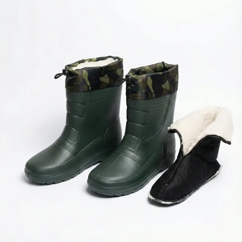 Зручні та легкі чоловічі напівчоботи з матеріалу ЕВА — це відмінна альтернатива високим гумовим чоботам. Вони набагато легші, швидше взуваються і не сковують рухів, що робить їх ідеальним варіантом для господарських робіт, прогулянок у ліс або використання у приватному секторі. Модель виготовлена з морозостійкої піни, яка не пропускає вологу та добре зберігає тепло. Верхня частина оздоблена стильною вставкою з камуфляжної тканини, яка додає взуттю практичності. Головна перевага — знімний хутряний утеплювач (вкладиш). Він забезпечує комфорт та тепло в холодну погоду, а за потреби його можна легко витягнути, щоб просушити або випрати. Чоботи мають рельєфну підошву, що зменшує ковзання на бруді та снігу. Характеристики: Сезон: Зима / Холодна осінь Матеріал верху: Піна ЕВА (водонепроникна) Утеплювач: Знімна панчоха (хутро/текстиль) Особливості: Камуфляжний манжет, укорочена модель Колір: Темно-зелений (Хакі) Тип: Напівчоботи / Високі галоші Розміри в наявності: 41, 42, 43, 44, 45