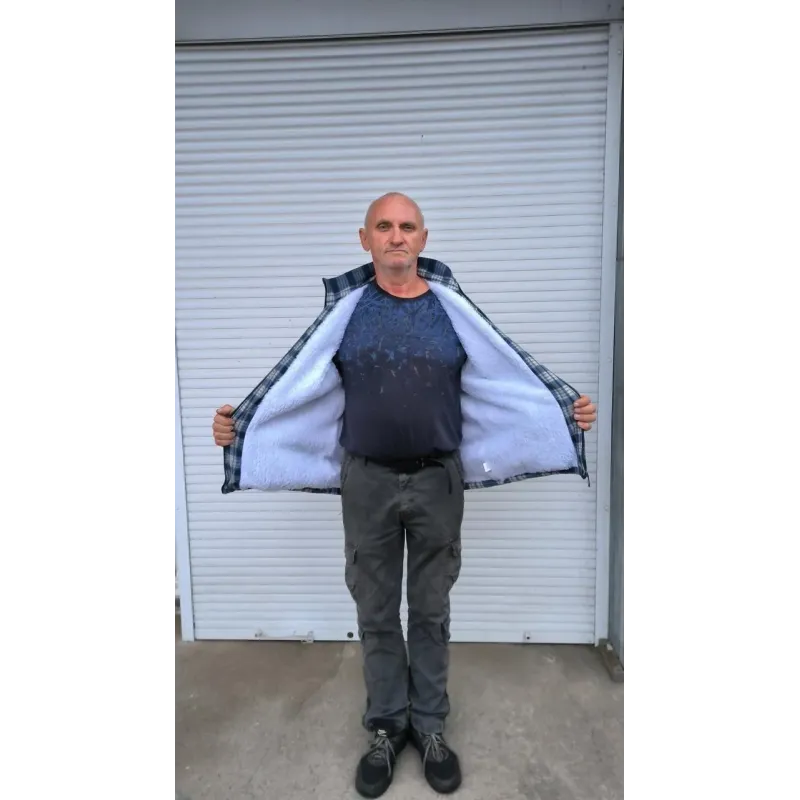 Стильна та функціональна чоловіча куртка-сорочка з капюшоном — хіт цього зимового сезону. Модель поєднує в собі класичний вигляд картатої сорочки та тепло зимової куртки. Верх виробу виконаний з щільної, приємної на дотик тканини (під байку/вовну), а внутрішня частина повністю утеплена густим білим штучним хутром (під овчину). Головна особливість моделі — теплий капюшон зі шнурками, який надійно захищає голову та шию від вітру та снігу. Куртка застібається на блискавку, має манжети на рукавах та чотири кишені: дві нагрудні з клапанами на ґдзиках та дві зручні бічні для рук. Це універсальна річ, яка пасує під джинси або спортивні штани. Ідеальний варіант для тих, хто не любить громіздкі пуховики, але хоче почуватися тепло та комфортно. Характеристики: Тип виробу: Куртка-сорочка з капюшоном Утеплювач: Штучне хутро "овчина" (корпус та капюшон) Застібка: Блискавка Кишені: 2 нагрудні, 2 бічні Колір: Чорно-сіра клітинка (як на фото) Особливості: Капюшон регулюється шнурком Сезон: Зима / Холодна осінь