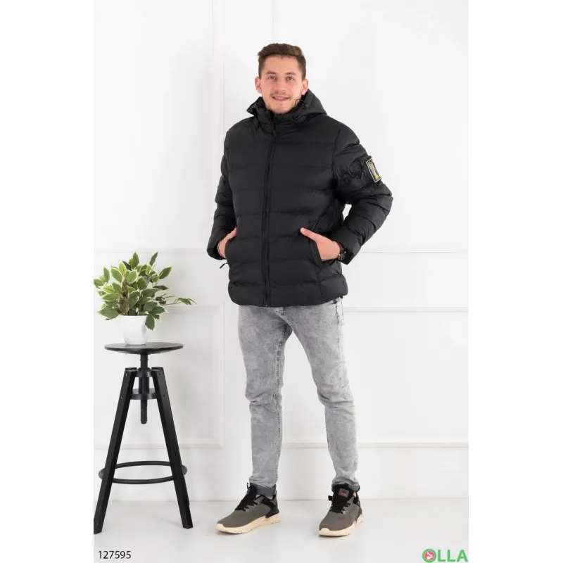 Чоловіча зимова куртка чорна з капюшоном, тепла парка на штучній вовні, коротка 56