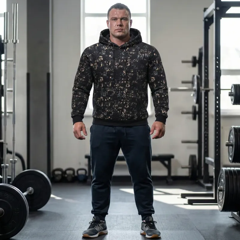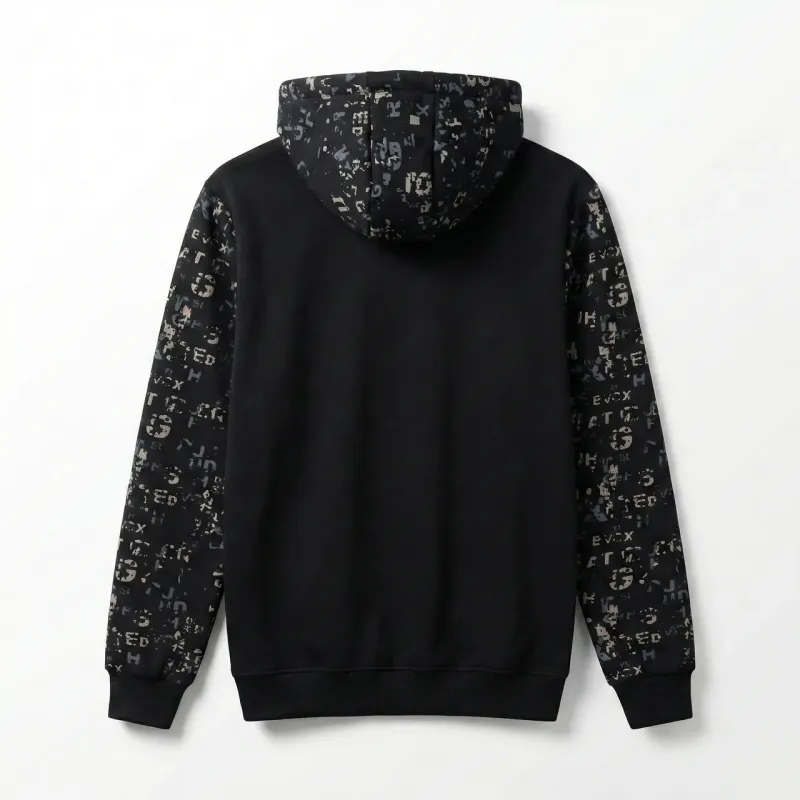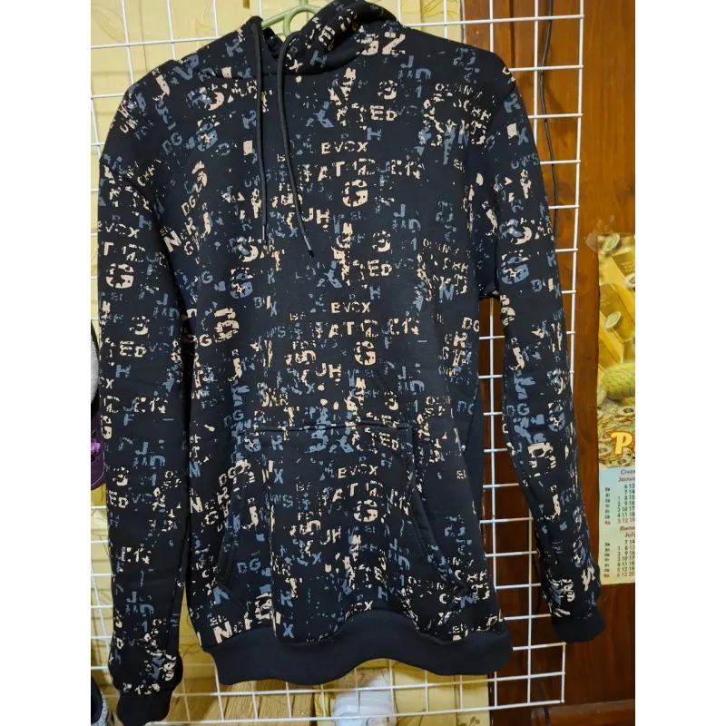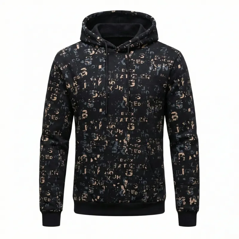 Стильне та зручне чоловіче худі з оригінальним принтом — базовий елемент гардероба для тих, хто цінує комфорт та сучасний вуличний стиль. Модель представлена в широкій розмірній сітці (46, 48, 50, 52), що дозволяє підібрати ідеальну посадку на будь-яку фігуру. Худі виконане в чорному кольорі з контрастним абстрактним візерунком із літер на передній частині та рукавах. Спинка залишається однотонною, додаючи образу лаконічності. Виріб оснащений глибоким капюшоном зі шнурками та місткою кишенею "кенгуру". Еластичні манжети на рукавах та по низу забезпечують захист від вітру та зручність у носінні. Тканина приємна до тіла, не кошлатиться і добре переносить прання. Характеристики: Розміри в наявності: 46, 48, 50, 52. Колір: Чорний. Декор: Принт (Тайпографіка/Літери). Фасон: Прямий крій, з капюшоном і кишенею. Сезон: Весна, Осінь, Зима. Стиль: Молодіжний, Спортивний, Casual.