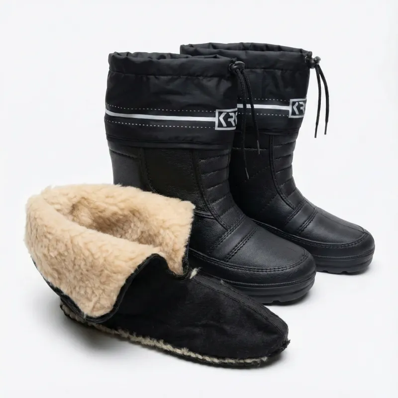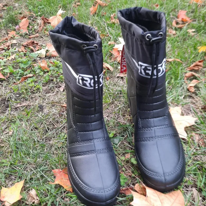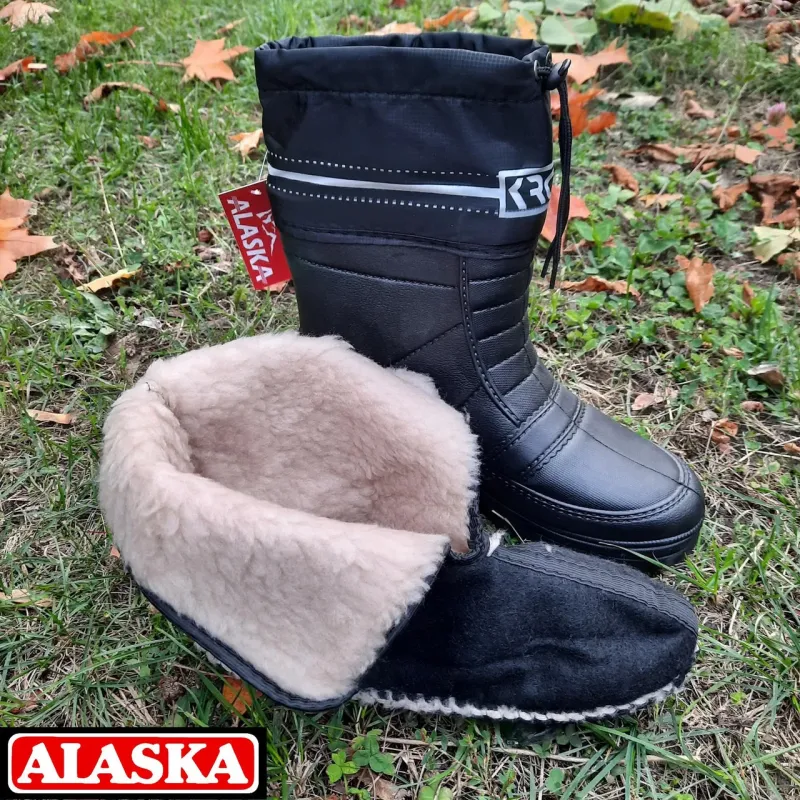 Універсальні чоловічі чоботи на холодну пору року, зимові чоботи для риболовлі, полювання, тривалого проведення часу на вулиці, походів і прогулянок. Розмір 41, 42, 43, 44, 45. Чоботи з ЕВА зі знімною вкладкою із овчини. Рибальські чоботи до -30 °C. Виробництво — Україна, експортна партія компанії Крок із биркою Alaska, яка виробляє якісне взуття спец призначення. Модель вироблена для постачання до Європи. Має фірмову етикетку. Ця модель чоловічих чобіт обладнана світловідбивною смужкою, яка гарантує безпеку під час проходження в місцях руху транспорту. Колір чорний Матеріал чобота – ЕВА + плащова тканина. Матеріал вкладки — повсть + збита овчина. Висота халяви — 28,5 см. Додатково: шнурок для утягування халяви. Зносостійкі якісні чоботи зі спіненого матеріалу ЕВА, зроблені суцільно литим способом, що гарантує тривалість носіння і прирівнює ймовірність промокання чобіт до нуля. Чоловічі чоботи з ЕВА забезпечать тепло та комфорт ваших ніг упродовж тривалого часу. ЕВА — матеріал, який не пропускає холод і вологу, не промокає, є найбільш зносостійким із собі подібних, простий у догляді та доступний за ціною. Рибальські чоботи популярні і в домашньому господарстві, є універсальним взуттям. Легко миються й миттєво висихають. Чоботи можна носити без вкладки як захист від води в теплу пору року. Під час настання осінньо-зимового періоду вкладка на основі повсті та набивної овчини забезпечить тепло та комфорт усередині чобота. Зверху є широка плащова вставка — манжета на утяжці, яка додатково перешкоджає потраплянню бруду та вологи всередину чобота. Підошва досить щільна та товста для захисту від модернозої землі та снігу, з глибоким протектором, завдяки чому чоботи не ковзають у гомілку. Такі чоловічі зимові чоботи — чудовий вибір практичних чоловіків. Вітчизняні зимові черевики на хутрі витримають найнижчі температури та залишать ноги в комфорті, сухості та теплі. Доставка виготовляється зручним вам поштовим оператором: Укр пошта, Нова пошта, Justin.
