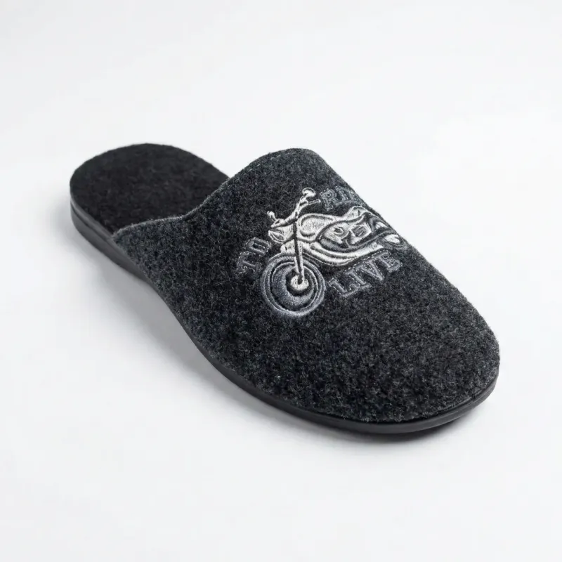 Стильні та зручні чоловічі тапочки для дому, які стануть чудовим подарунком для будь-якого чоловіка, а особливо — для любителів мототехніки. Верх моделі виконаний з якісного щільного повсті (фетру) сірого кольору, який добре пропускає повітря, але при цьому зберігає ноги в теплі. Головна "фішка" цієї моделі — якісна вишивка у вигляді мотоцикла (чопера) та напису "TO RIDE LIVE". Тапочки мають зручну анатомічну форму та відкриту п'яту, що дозволяє легко їх взувати. М'яка устілка та практична чорна підошва забезпечують комфорт при ходьбі по плитці, ламінату чи лінолеуму. Це зносостійке та практичне взуття, яке не потребує складного догляду. Чудовий вибір для дому або як змінне взуття для гостей. Характеристики: Матеріал верху: Повсть / Текстиль Декор: Вишивка "Мотоцикл" Підошва: ПВХ (міцна, не ковзає) Устілка: Текстиль, чорного кольору Колір: Темно-сірий Розміри: 41, 42, 43, 44, 45