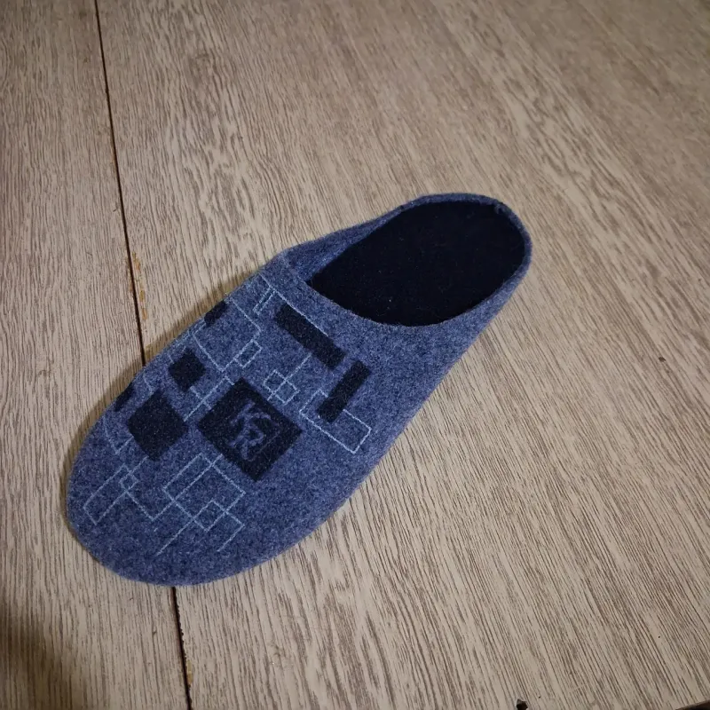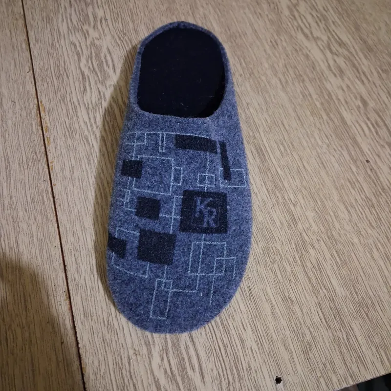 Практичні сірі капці з повсті. Сучасний геометричний принт "KR". Анатомічна підошва Klerotex. Легкі, теплі, дихаючі. Розміри 41-45. Повний опис: Ці чоловічі тапочки Klerotex у сірому кольорі — ідеальний вибір для чоловіків, які цінують практичність. Світло-сіра повсть (фетр) виглядає стильно і сучасно, а головне — на ній майже не помітний домашній пил. Верх прикрашений лаконічним геометричним візерунком із квадратами та логотипом «KR». Це додає моделі індивідуальності, не роблячи її занадто яскравою. Чому обирають цю модель: Натуральний комфорт: Повсть — це дихаючий матеріал. Взимку в ньому тепло, а влітку не жарко. Підошва Klerotex: Фірмова підошва з поліуретану/ПВХ забезпечує амортизацію при ходьбі та не ковзає. Зручна посадка: Устілка чорного кольору (не мазка) приємна до стопи. Характеристики: Виробник: Klerotex (Україна) Тип: Кімнатні тапочки Матеріал верху: Повсть (фетр) Матеріал підошви: ПВХ (Klerotex) Колір: Сірий (Grey) Декор: Принт "Геометрія", лого "KR" Розміри: 41, 42, 43, 44, 45