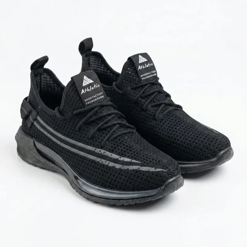 Зустрічайте хіт літнього сезону від української фабрики Gipanis (серія Athletic)! Ці чорні чоловічі кросівки створені для тих, хто цінує максимальну свободу рухів. Верх моделі виконаний за технологією безшовної в'язки (текстильна сітка), завдяки чому взуття сідає по нозі як шкарпетка — ніде не тисне і забезпечує ідеальну вентиляцію. Кросівки мають сучасний дизайн із декоративною шнурівкою та стильними бічними смужками. Цілісна конструкція верху (без окремого язичка) дозволяє взуватися миттєво. Чорна підошва виготовлена зі спіненого ПВХ — вона дуже легка, пружна та доповнена глянцевою вставкою на п'яті для додаткової стабілізації та ефектного вигляду. Це взуття ідеальне для повсякденного носіння у спеку, для легких пробіжок або тренувань у залі. Практичний чорний колір робить їх універсальними, а українське виробництво гарантує чудову якість за доступною ціною. Характеристики: Матеріал верху: В'язаний текстиль (сітка) Матеріал підошви: ПВХ / Піна (легка, з амортизацією) Сезон: Літо / Суха весна Стать: Чоловічі Колір: Чорний Розміри: 41-45 Виробник: Gipanis (Україна)