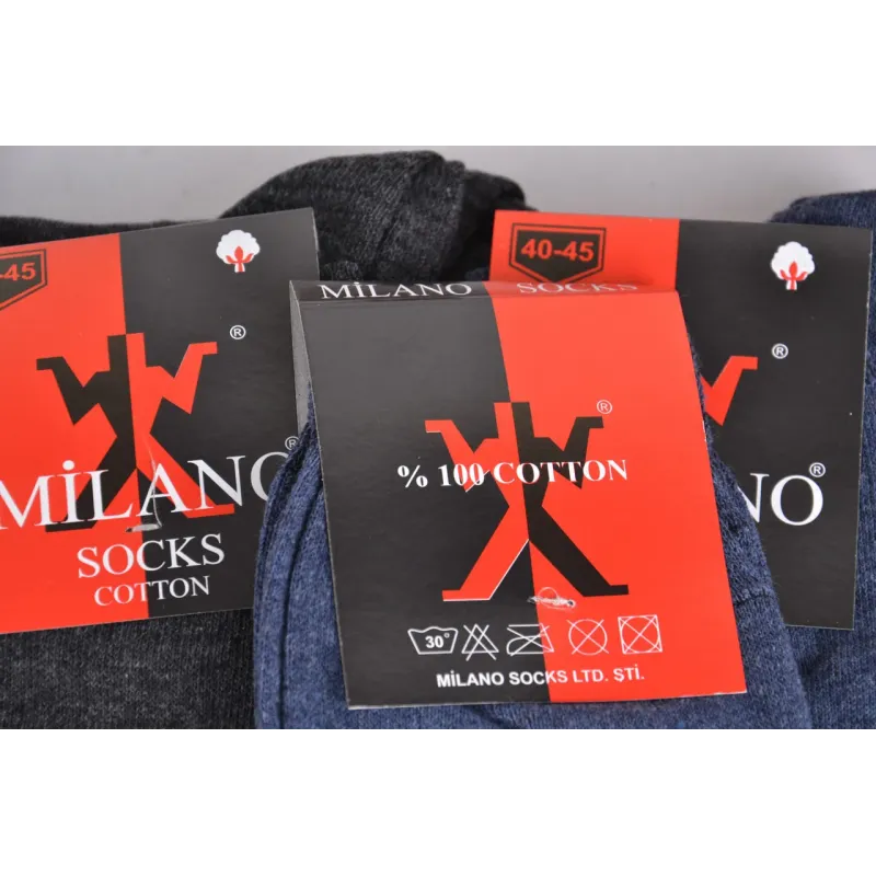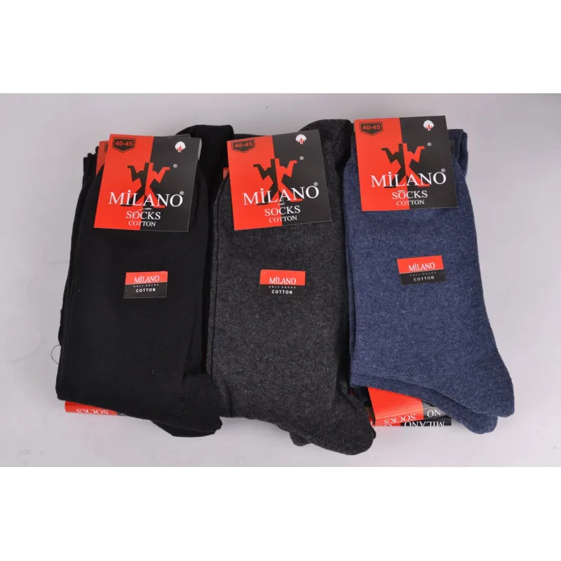 Чоловічі шкарпетки "Milano" хорошої якості Колір ― Як на фото Розмір ― Універсальний ( тягнуться від 40 до 45 розміру ) Кількість виробів в упаковці ― 12 пар ( одного розміру, mix кольорів) Склад ― 100% Бавовна Виробництво ― Китай