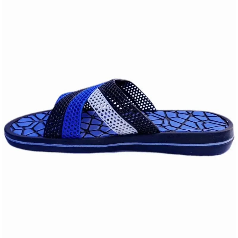 Ці чоловічі шльопанці Olimp вирізняються стильним спортивним дизайном та продуманою ергономікою. Модель виконана в ефектному поєднанні синього та чорного кольорів з білими вставками. Верх складається з двох перехресних широких ремінців, що забезпечує надійну фіксацію стопи та комфорт при ходьбі. Ремінці мають перфоровану структуру (сіточку) для відмінної вентиляції. Збоку розташований помітний логотип "Olimp". Особливої уваги заслуговує устілка з унікальним геометричним візерунком (нагадує павутиння або мозаїку), який не лише стильно виглядає, а й запобігає ковзанню мокрої ноги всередині взуття. Характеристики: Бренд/Модель: Olimp. Тип: Шльопанці (Cross slides). Конструкція: Перехресні ремінці. Колір: Синій з чорним та білим (Blue/Black). Матеріал: ПВХ / Гума. Розмірний ряд: 41, 42, 43, 44, 45.