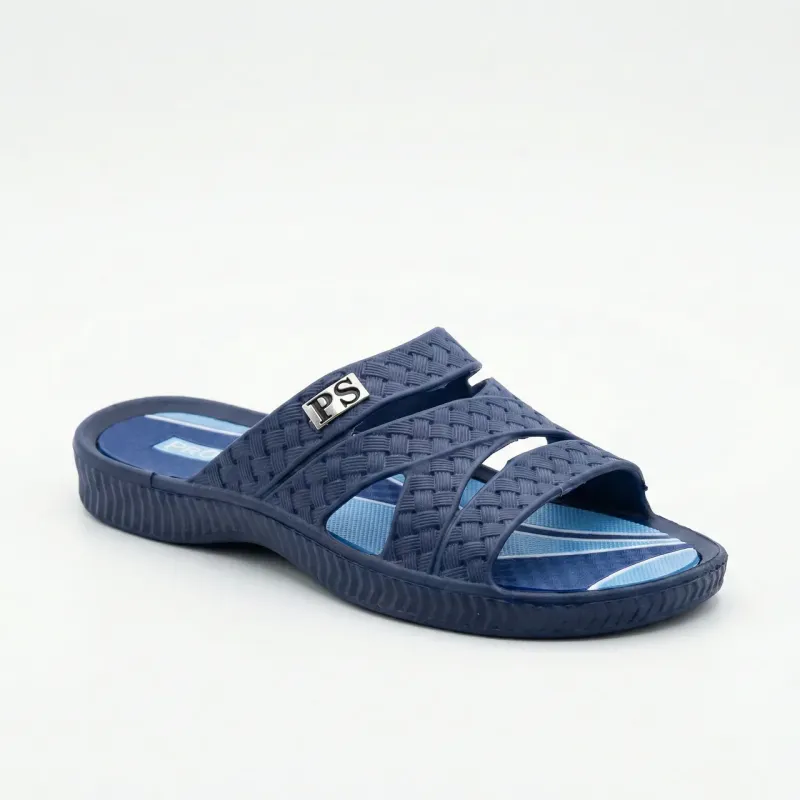 Ці темно-сині чоловічі шльопанці — універсальний вибір для літнього відпочинку та водних процедур. Модель вирізняється лаконічним дизайном та високою зносостійкістю. Верх виконаний у вигляді широкого ремінця з цікавою фактурою "плетіння" та вентиляційними отворами, що дозволяє нозі дихати. Збоку розташований металевий декоративний елемент з логотипом "PS". Підошва пружна, не ковзає на мокрих поверхнях (плитка, бортик басейну) і легко миється. Внутрішня частина устілки має рельєфний малюнок світло-блакитного кольору, що забезпечує масажний ефект та запобігає ковзанню стопи. Характеристики: Тип: Шльопанці / Сланці. Сезон: Літо. Колір: Темно-синій (Dark Blue). Матеріал: ПВХ / Гума (водостійкі). Розмірний ряд: 41, 42, 43, 44, 45. Призначення: Пляж, басейн, сауна, дім.