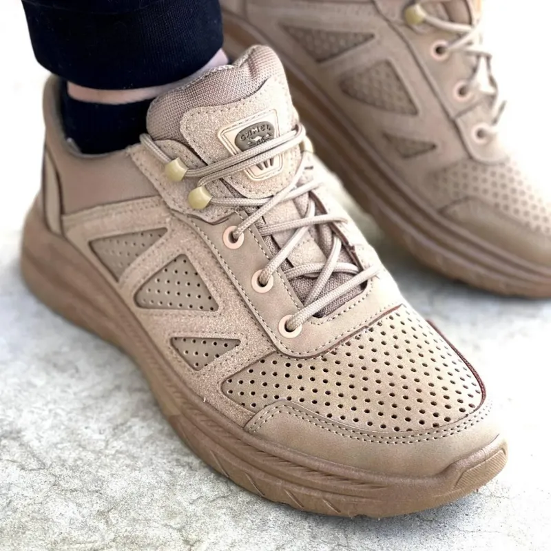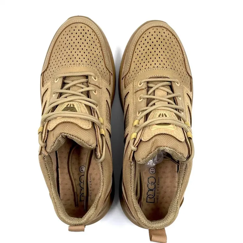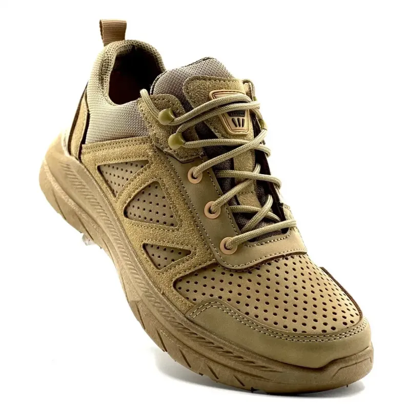 Представляємо надійні та стильні чоловічі кросівки у популярному тактичному кольорі "койот". Ця модель розроблена спеціально для активного використання в теплу пору року. Вони ідеально підійдуть як військовим та працівникам силових структур, так і шанувальникам стилю мілітарі, туризму чи просто комфортного повсякденного взуття. Верх виготовлено з якісного еко-нубуку, який відрізняється високою зносостійкістю. Головна особливість моделі — наскрізна перфорація по всій поверхні, що забезпечує відмінну вентиляцію. Ваші ноги залишатимуться сухими та в комфорті навіть у найспекотніші дні. Посилена шнурівка та м'який язичок гарантують надійну фіксацію стопи без зайвого тиску. Підошва моделі виконана з легкого та міцного матеріалу, має глибокий протектор для гарного зчеплення з різними поверхнями. Вона досить гнучка, щоб не сковувати рухи, але при цьому міцна, щоб захистити стопу від нерівностей ґрунту. Універсальний бежевий колір добре маскує пил та бруд, що робить взуття дуже практичним у догляді. Характеристики: Матеріал верху: Еко-нубук з перфорацією Матеріал підошви: ПВХ / Піна (посилена, з протектором) Сезон: Літо / Тепла весна-осінь Стать: Чоловічі Колір: Койот (бежевий/пісочний) Розміри: 41-45 Країна виробник: Фабричний Китай