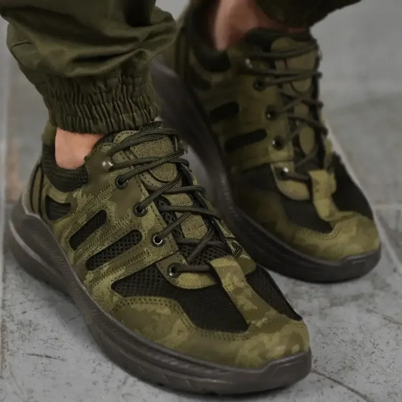 Спеціалізовані літні тактичні кросівки у забарвленні "піксель" (хакі) — оптимальний вибір для військовослужбовців та любителів стилю мілітарі. Головна особливість моделі — верх із міцної дихаючої сітки, яка забезпечує чудову терморегуляцію та швидке відведення вологи навіть у найсильнішу спеку. Конструкція взуття передбачає посилені вставки з еко-матеріалів у найбільш вразливих зонах (носок, п'ята, бічні частини), що значно підвищує зносостійкість виробу в екстремальних умовах. Підошва має глибокий протектор для надійного зчеплення з різними типами поверхонь (трава, ґрунт, пісок) та добре поглинає удари при бігу чи стрибках. Класична шнурівка надійно фіксує стопу, а м'яка внутрішня підкладка запобігає натиранню при тривалих переходах. Кросівки легкі, практичні та ідеально поєднуються зі статутною військовою формою. Характеристики: Тип взуття: Тактичні кросівки / Трекінгове взуття Матеріал верху: Текстильна 3D сітка + посилені вставки Матеріал підошви: ПВХ/Піна (протекторна) Колір: Хакі (Зелений) + принт Піксель Сезон: Літо Застібка: Шнурівка Розміри: 41-45