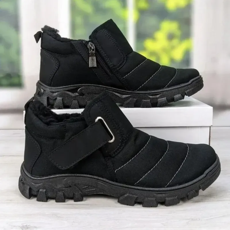 Зустрічайте холодну пору року у комфорті з нашими чоловічими зимовими черевиками-дутиками. Ця модель розроблена спеціально для тих, хто цінує тепло, практичність та зручність. Верх виготовлений з міцного водовідштовхувального текстилю, який надійно захищає від вітру, снігу та вологи, зберігаючи ноги сухими за будь-якої погоди. Всередині черевики утеплені густим штучним хутром, що забезпечує відмінну терморегуляцію навіть у сильні морози. Особливістю моделі є комбінована застібка: зручна липучка дозволяє відрегулювати взуття під будь-який підйом стопи, а бічна блискавка значно прискорює процес взування. Це ідеальний вибір для чоловіків будь-якого віку, включаючи людей похилого віку, завдяки легкості та м'якості. Підошва виконана із зносостійкого матеріалу з глибоким протектором, що гарантує надійне зчеплення зі слизькою поверхнею та запобігає ковзанню. Чорний колір робить модель універсальною та невибагливою у догляді — достатньо просто протерти поверхню вологою губкою. Характеристики: Сезон: Зима / Холодна осінь Матеріал верху: Водовідштовхувальний текстиль (плащівка) Матеріал підкладки: Штучне хутро Застібка: Липучка + Блискавка Колір: Чорний Розміри: 40-46 Підошва: Протиковзка, рифлена