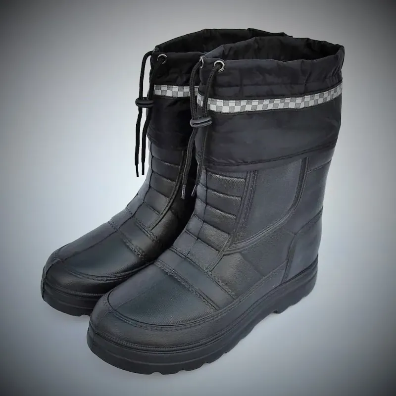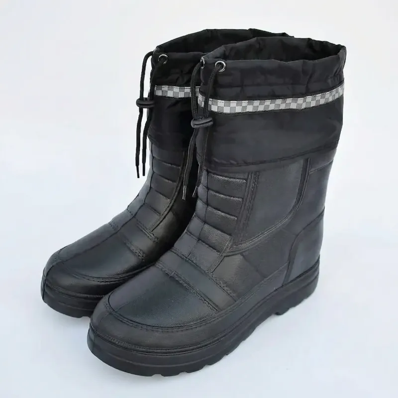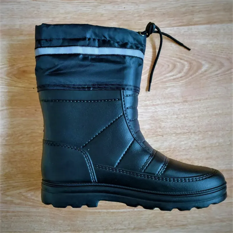 Надійні чоловічі чоботи для зимової негоди, які поєднують у собі тепло, легкість та безпеку. Нижня частина (калоша) відлита з піни ЕВА (EVA), що забезпечує повну водонепроникність та відмінну термоізоляцію. Ваші ноги залишаться сухими та теплими навіть у сльоту та мороз. Переваги цієї моделі: Безпека: На манжеті розташована широка світловідбиваюча (рефлекторна) стрічка. Вона робить вас помітним у темний час доби при світлі фар, що критично важливо для безпеки на дорозі. Захист від снігу: Верхня частина оснащена манжетою зі шнурком та фіксатором (затяжкою). Це надійно захищає від потрапляння снігу та вологи всередину через верх. Знімний утеплювач: Чоботи комплектуються теплою повстяною вставкою (панчохою), яку можна легко вийняти для просушування або прання. Це ідеальний вибір для роботи на вулиці, прогулянок з собакою, поїздок на дачу або зимової риболовлі. Характеристики: Матеріал низу: Піна ЕВА (цільнолита) Матеріал верху: Водовідштовхувальна тканина Особливість: Світловідбиваюча стрічка (рефлектор) Утеплювач: Знімний вкладиш Застібка: Шнурок-затяжка зверху Колір: Чорний Розміри: 41, 42, 43, 44, 45 Сезон: Зима / Холодна осінь