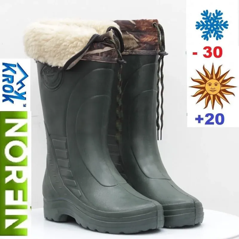 Універсальні та надлегкі чоловічі чоботи з матеріалу ЕВА — це незамінне взуття для риболовлі, полювання, роботи на дачі або прогулянок у сльоту та мороз. Головна особливість цієї моделі — здатність витримувати екстремально низькі температури (до -30°С) завдяки своїй структурі та теплому вкладишу. Чоботи виготовлені методом цільного лиття з сучасної піни ЕВА (етиленвінілацетат). Цей матеріал у рази легший за звичайну гуму, не пропускає вологу та має відмінні термоізоляційні властивості (працює як термос). Навіть при тривалому носінні ноги не втомлюються. Модель комплектується теплим знімним вкладишем з хутряною обробкою, який можна легко вийняти для просушування або прання. Верхня частина утеплювача оснащена манжетою з водовідштовхувальної тканини забарвлення "камуфляж" та затяжкою-фіксатором. Це надійно захищає від потрапляння снігу, бруду та води всередину чобота. Рифлена підошва забезпечує стійкість на слизьких поверхнях. Це взуття підходить як для сильних морозів, так і для відлиги. Характеристики: Матеріал: Піна ЕВА (EVA) Сезон: Зима / Осінь / Весна (до -30°С) Утеплювач: Знімна панчоха (штучне хутро + текстиль) Колір: Олива (Хакі) Особливості: Водонепроникні, манжета із затяжкою Призначення: Риболовля, полювання, господарські роботи Країна виробник: Україна (Krok)