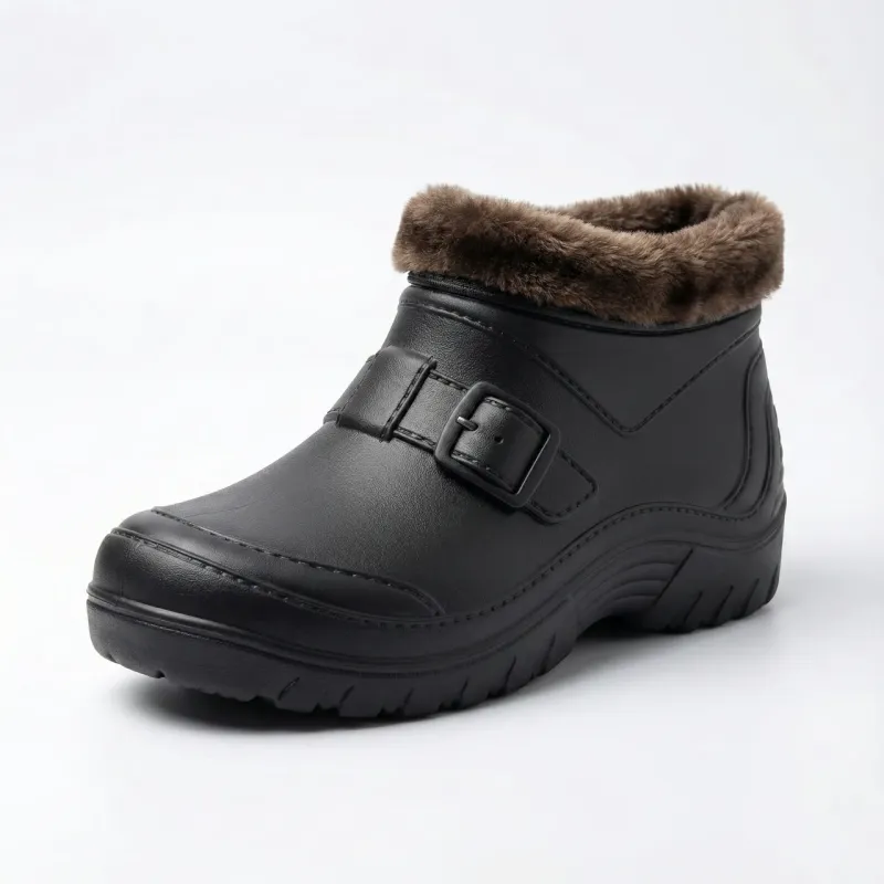 Практичні та надійні чоловічі черевики (калоші), що поєднують строгий дизайн та максимальний захист від негоди. Особливістю цієї моделі є декоративний елемент у вигляді ремінця з пряжкою, який відлитий разом із взуттям. Це надає калошам вигляду класичних шкіряних черевиків, але при цьому зберігає повну герметичність. Взуття виготовлене з суцільнолитої піни ЕВА (EVA) — матеріалу, який не пропускає ні краплі води, відмінно тримає тепло та залишається еластичним навіть у мороз. Всередині черевики утеплені густим штучним хутром, що робить їх ідеальним вибором для зими та сльотавого міжсезоння. Завдяки широкій горловині черевики легко взуваються, а рифлена підошва забезпечує стійкість на слизьких поверхнях. Вони незамінні для господарських робіт, прогулянок або торгівлі на ринку в холодну пору. Характеристики: Матеріал: Піна ЕВА (EVA) — 100% захист від вологи. Утеплювач: Штучне хутро (незнімне). Дизайн: Імітація ремінця з пряжкою. Колір: Чорний. Сезон: Зима / Холодна осінь. Розмірний ряд: 41-45 (повномірні). Країна виробник: Україна.