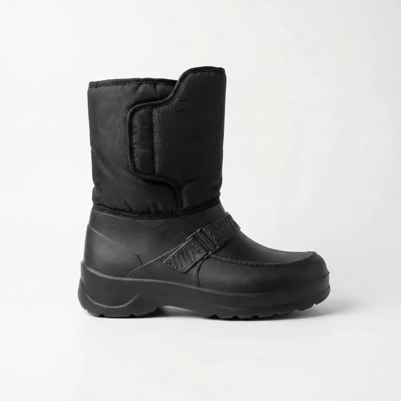 Універсальні та практичні чоловічі зимові чоботи, які стануть незамінними в холодну та мокру погоду. Ця модель розроблена з акцентом на зручність взування: завдяки широкій халяві та великій застібці на липучці, чоботи легко одягати навіть людям з високим підйомом ноги або широкою стопою. Нижня частина взуття відлита з сучасного матеріалу ЕВА (пінка), який є на 100% водонепроникним, дуже легким та відмінно утримує тепло, не пропускаючи холод від землі. Верх виготовлений з міцного текстилю, який захищає від вітру та снігу. Всередині чоботи утеплені густим штучним хутром. Це чудовий бюджетний варіант для повсякденного носіння у селі, на дачі, для прогулянок із собакою чи прибирання снігу. Підошва має рифлену структуру для запобігання ковзанню. Характеристики: Тип взуття: Дутики / Чоботи комбіновані Матеріал низу: Піна ЕВА (суцільнолита, легка) Матеріал верху: Водовідштовхувальний текстиль Утеплювач: Штучне хутро Застібка: Широка липучка (зручний вхід) Сезон: Зима / Холодна осінь Колір: Чорний Розміри: 41-46