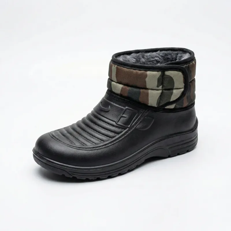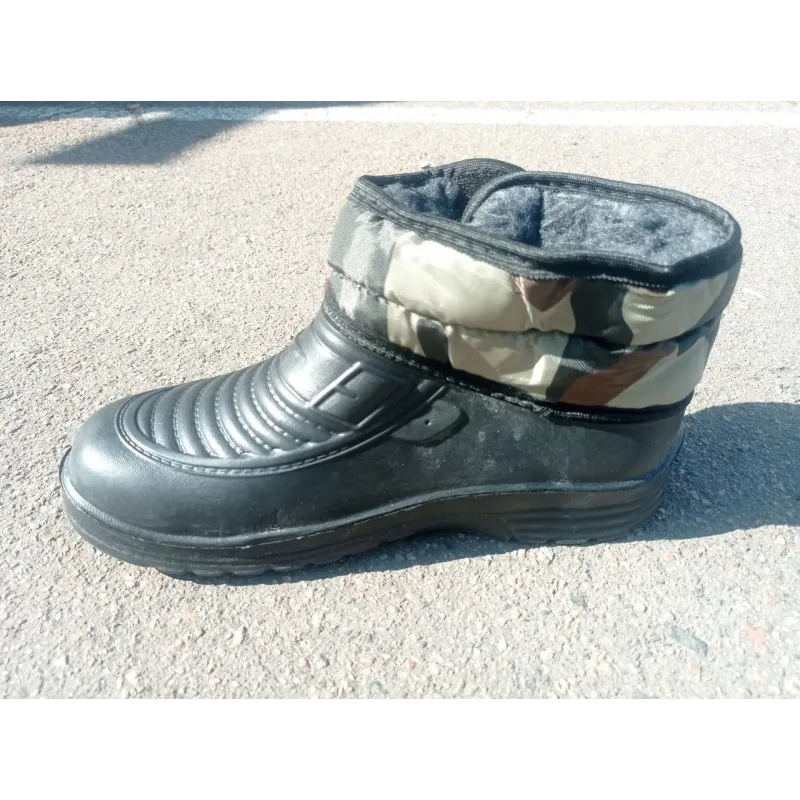 Ці зимові калоші-бурки — ідеальне рішення для тих, хто шукає максимальний комфорт і тепло для ніг взимку. Модель поєднує в собі легкість сучасних матеріалів та зручність домашнього взуття. Чому обирають цю модель: Зручність взування: Завдяки широкому отвору та застібці на липучці, ці бурки легко взуваються на будь-яку ногу (навіть з високим підйомом або набряками). Це робить їх чудовим подарунком для дідусів та батьків. Тепло: Всередині бурки повністю утеплені густим штучним хутром, яке чудово зберігає тепло навіть у сильний мороз. Захист від вологи: Нижня частина (калоша) виготовлена з легкої та водонепроникної пінки (EVA). Ви можете сміливо виходити у сніг чи сльоту — ноги залишаться сухими. Верх виконаний з міцного текстилю у практичному кольорі "камуфляж", на якому не видно бруду. Характеристики: Тип: Бурки / Короткі зимові чоботи. Розміри: 41, 42, 43, 44, 45, 46. Матеріал низу: Пінка (EVA). Матеріал верху: Водовідштовхувальна тканина (Камуфляж). Застібка: Липучка (Velcro). Утеплювач: Штучне хутро.
