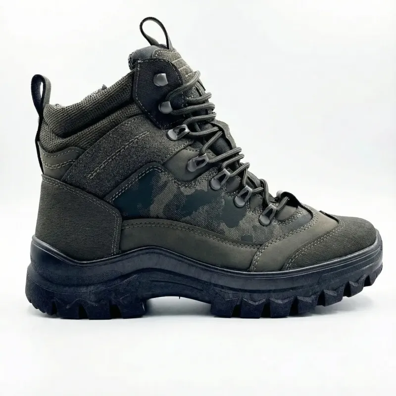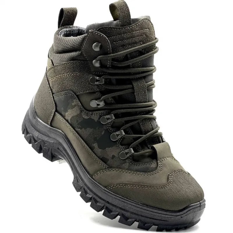 Надійні та теплі чоловічі черевики у стилі "мілітарі" — ідеальний вибір для суворої зими. Ця модель поєднує в собі практичність тактичного взуття та комфорт спортивних моделей. Верх виготовлений з якісних комбінованих матеріалів (еко-нубук та міцний текстиль), що забезпечує зносостійкість та захист від зовнішніх пошкоджень. Стильний колір хакі доповнено вставками з камуфляжним принтом "піксель". Всередині черевики утеплені густим хутром, яке відмінно зберігає тепло навіть при тривалому перебуванні на холоді. Важливою перевагою є наявність бічної блискавки, що дозволяє швидко взувати та знімати взуття, не розшнуровуючи його щоразу. Шнурівка з металевими петлями надійно фіксує гомілковостоп, запобігаючи травмам під час ходьби по нерівній місцевості. Масивна підошва з глибоким протектором гарантує стійкість на снігу, льоду та бруді. Черевики підходять для військовослужбовців, співробітників силових структур, туристів, мисливців та всіх, хто веде активний спосіб життя в зимовий період. Характеристики: Сезон: Зима Матеріал верху: Еко-нубук + Текстиль (Кордура) Матеріал підкладки: Густе хутро (Штучне) Застібка: Шнурівка + Блискавка Колір: Хакі (Олива) + Піксель Розміри: 41-45 Особливості: Посилений носок і п'ята, тракторна підошва