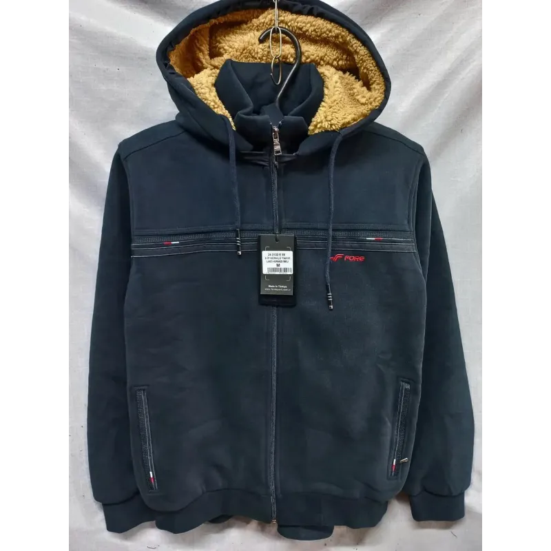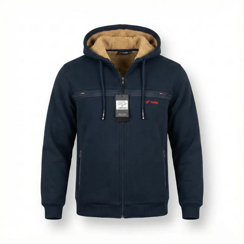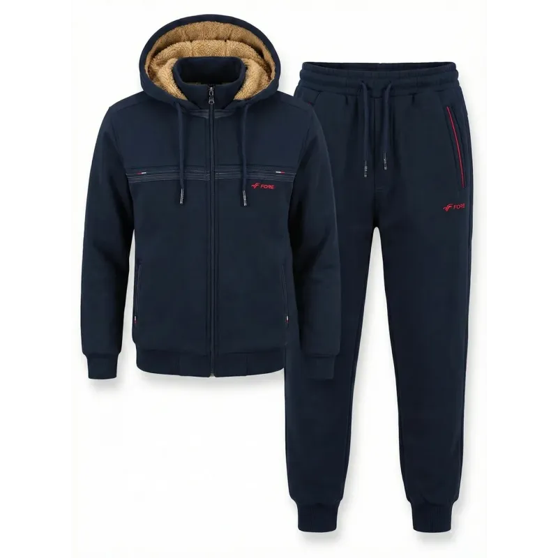 Максимально теплий та комфортний чоловічий спортивний костюм від бренду FORE. Це ідеальне рішення для найхолодніших зимових днів. Головна особливість моделі — густе утеплення під "овчину" (штучне хутро), яке покриває внутрішню частину кофти та капюшона. Такий шар утеплення працює як термобілизна, чудово зберігаючи тепло навіть у мороз. Комплект складається з кофти на блискавці та зручних штанів. Дизайн доповнений стильною горизонтальною вставкою на грудях та акуратним логотипом бренду. Для зручності передбачені кишені на блискавках на кофті та штанах, що дозволяє безпечно носити з собою дрібні речі. Тканина верху щільна, не продувається вітром і стійка до зношування. Еластичні манжети забезпечують ідеальну посадку по фігурі. Характеристики: Бренд: FORE. Сезон: Глибока зима. Утеплювач: Густе штучне хутро (під овчину). Особливості: Кишені на блискавках, капюшон з хутром. Матеріал: Трикотаж високої щільності. Колір: Темно-синій. Розмірний ряд: M, L, XL, XXL, XXXL (46-54).