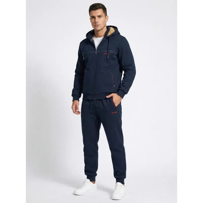 Максимально теплий та комфортний чоловічий спортивний костюм від бренду FORE. Це ідеальне рішення для найхолодніших зимових днів. Головна особливість моделі — густе утеплення під "овчину" (штучне хутро), яке покриває внутрішню частину кофти та капюшона. Такий шар утеплення працює як термобілизна, чудово зберігаючи тепло навіть у мороз. Комплект складається з кофти на блискавці та зручних штанів. Дизайн доповнений стильною горизонтальною вставкою на грудях та акуратним логотипом бренду. Для зручності передбачені кишені на блискавках на кофті та штанах, що дозволяє безпечно носити з собою дрібні речі. Тканина верху щільна, не продувається вітром і стійка до зношування. Еластичні манжети забезпечують ідеальну посадку по фігурі. Характеристики: Бренд: FORE. Сезон: Глибока зима. Утеплювач: Густе штучне хутро (під овчину). Особливості: Кишені на блискавках, капюшон з хутром. Матеріал: Трикотаж високої щільності. Колір: Темно-синій. Розмірний ряд: M, L, XL, XXL, XXXL (46-54).