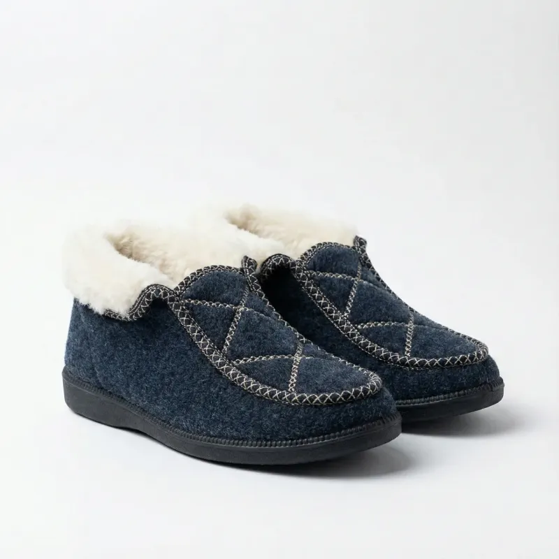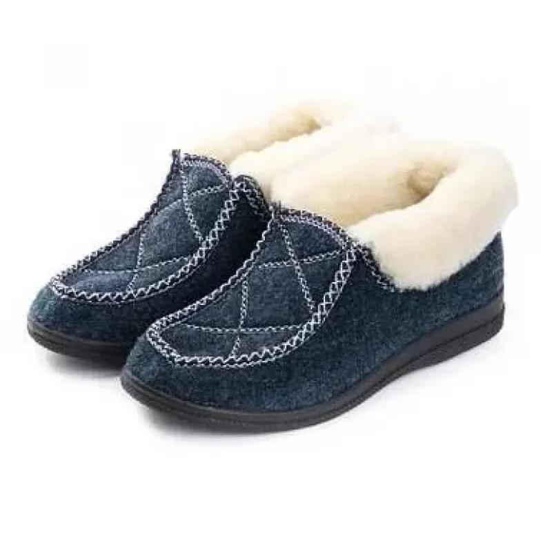 М'які, теплі та затишні короткі чуні (бурки) — незамінне взуття для холодної пори року. Ця модель ідеально підходить для використання вдома, на дачі або для виходу на подвір'я в суху погоду. Завдяки широкому входу та відсутності застібок, вони дуже легко взуваються, що робить їх чудовим вибором для людей похилого віку. Верх виготовлений з якісного щільного сукна (текстиль/повсть) темно-синього кольору, прикрашеного декоративною білою строчкою. Всередині — густе та м'яке штучне хутро (світла овчина), яке чудово зберігає тепло. Хутряна окантовка зверху додає моделі комфорту та приємного вигляду. Підошва лита, виготовлена з ПВХ, гнучка та стійка до зносу. Вона надійно захищає від холоду з підлоги. Характеристики: Сезон: Зима / Холодна осінь Матеріал верху: Сукно (повсть) Матеріал підкладки: Штучне хутро (тепле) Колір: Синій (темний) Тип: Без застібки (сліпони) Підошва: ПВХ (не ковзає) Країна виробник: Україна Розміри в наявності: 37, 38, 39, 40, 41, 42