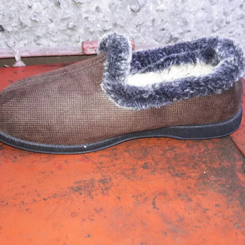 Зручні та м'які домашні чуні (капці) приємного шоколадного відтінку — чудовий вибір для збереження тепла в холодну пору року. Ця модель виготовлена з міцного фактурного текстилю, який добре тримає форму, але при цьому м'яко облягає стопу, не створюючи дискомфорту. Верх оздоблений пухнастою хутряною облямівкою (опушкою) сірого кольору, що додає моделі затишку та захищає від протягів. Всередині взуття утеплене, тому ваші ноги завжди будуть у теплі. Завдяки широкому входу та відсутності застібок (модель сліпон), чуні взуваються за мить — це ідеальний варіант для літніх людей. Підошва виготовлена з ПВХ, вона легка, гнучка та вологостійка, що дозволяє за необхідності вийти у двір. Коричневий колір дуже практичний у побуті, на ньому менше помітні забруднення. Характеристики: Сезон: Зима / Осінь Матеріал верху: Взуттєвий текстиль (фактурний) Матеріал підкладки: Штучне хутро Особливості: Хутряна опушка, легка вага, без застібок Колір: Коричневий (шоколад) Підошва: ПВХ (лита, чорна) Розміри в наявності: 38, 39, 40, 41, 42