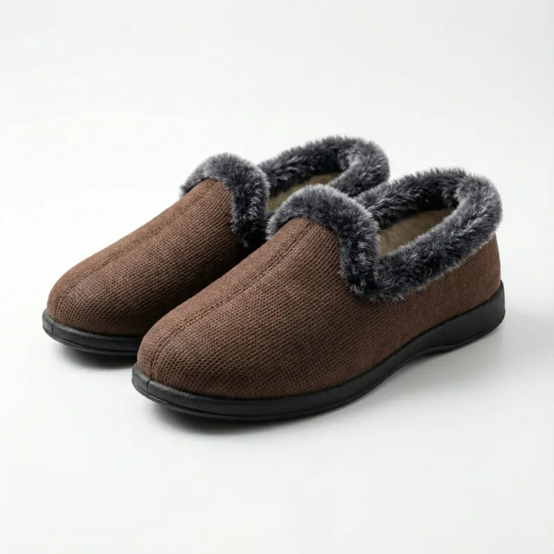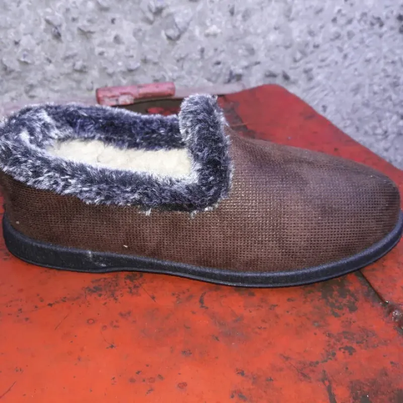 Зручні та м'які домашні чуні (капці) приємного шоколадного відтінку — чудовий вибір для збереження тепла в холодну пору року. Ця модель виготовлена з міцного фактурного текстилю, який добре тримає форму, але при цьому м'яко облягає стопу, не створюючи дискомфорту. Верх оздоблений пухнастою хутряною облямівкою (опушкою) сірого кольору, що додає моделі затишку та захищає від протягів. Всередині взуття утеплене, тому ваші ноги завжди будуть у теплі. Завдяки широкому входу та відсутності застібок (модель сліпон), чуні взуваються за мить — це ідеальний варіант для літніх людей. Підошва виготовлена з ПВХ, вона легка, гнучка та вологостійка, що дозволяє за необхідності вийти у двір. Коричневий колір дуже практичний у побуті, на ньому менше помітні забруднення. Характеристики: Сезон: Зима / Осінь Матеріал верху: Взуттєвий текстиль (фактурний) Матеріал підкладки: Штучне хутро Особливості: Хутряна опушка, легка вага, без застібок Колір: Коричневий (шоколад) Підошва: ПВХ (лита, чорна) Розміри в наявності: 38, 39, 40, 41, 42