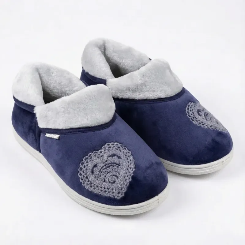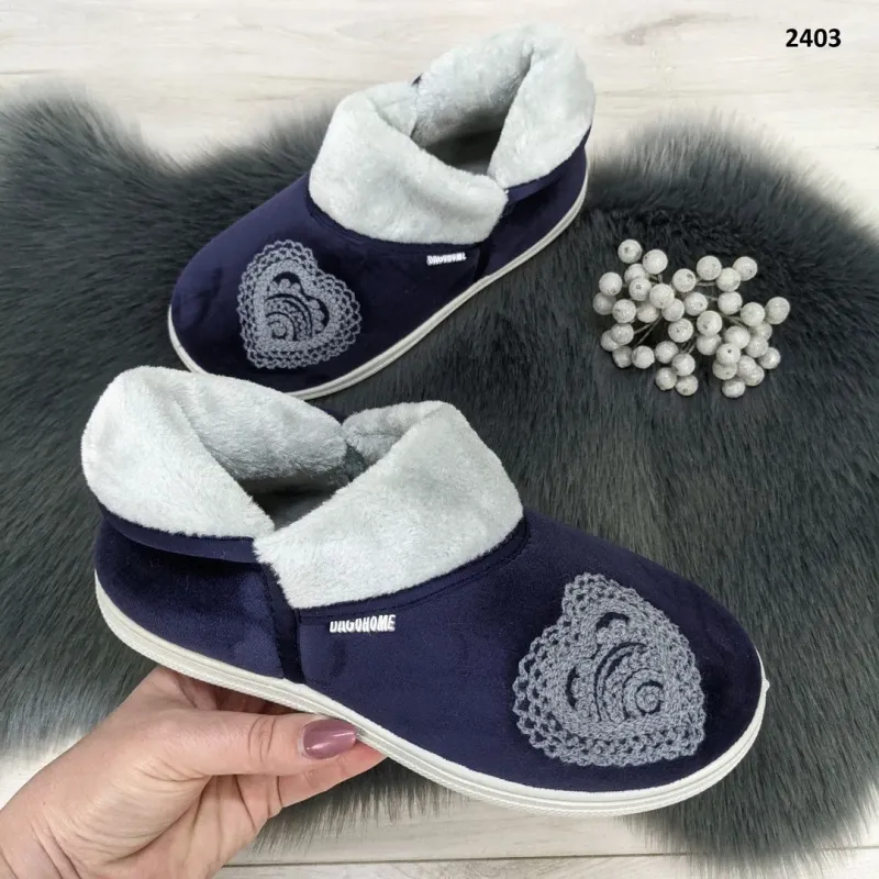 Неймовірно ніжні та теплі домашні чуні (капці) від популярного українського бренду Dagohome. Ця модель створена, щоб дарувати тепло та гарний настрій. Глибокий темно-синій колір верху стильно контрастує зі світлою підошвою та хутром, а головною прикрасою є велика ажурна вишивка у формі серця на носочку. Верх виготовлений з м'якого та приємного на дотик велюру. Всередині чуні утеплені густим світлим хутром, яке забезпечує комфорт навіть у найхолодніші дні. Верхній край має широкий хутряний відворот, що додає моделі затишку. Підошва білого кольору, прошита, виготовлена з еластичного матеріалу, стійка до зносу та не ковзає по плитці чи паркету. Завдяки зручній колодці ноги в такому взутті відпочивають після важкого дня. Характеристики: Сезон: Зима / Осінь / Весна Виробник: Dago Style (Україна) Матеріал верху: Текстиль (велюр) Матеріал підкладки: Тепле еко-хутро (світле) Декор: Вишивка «Ажурне серце», бірка бренду Колір: Темно-синій (Indigo) Підошва: ПВХ (прошита) Розміри в наявності: 37, 38, 39, 40, 41