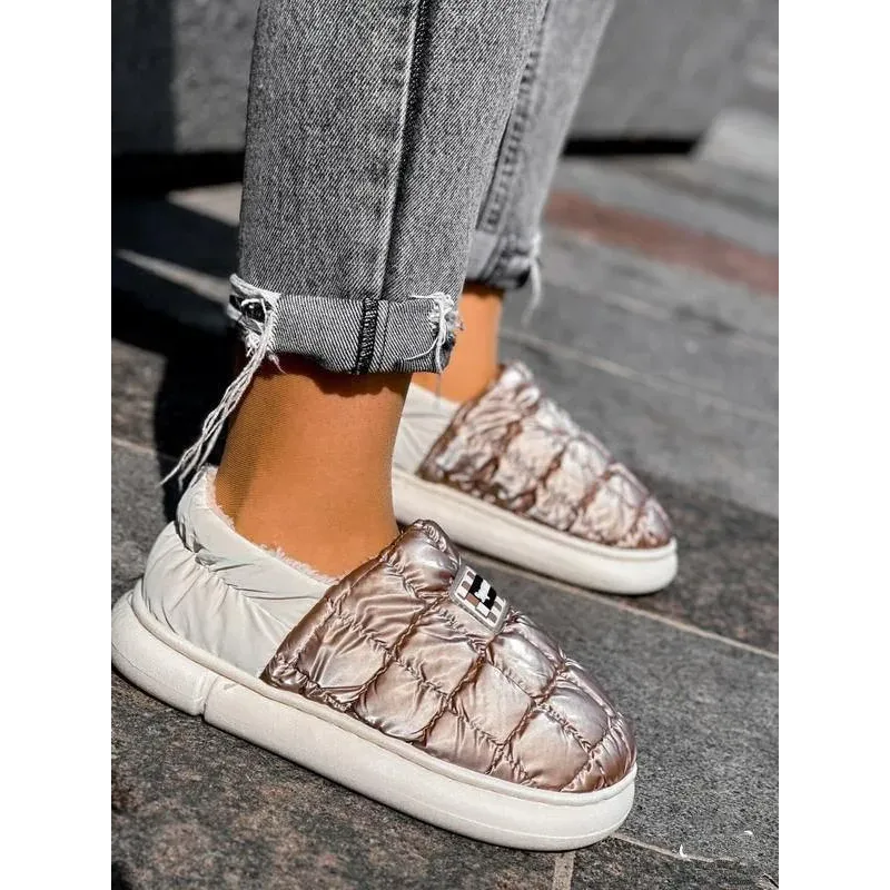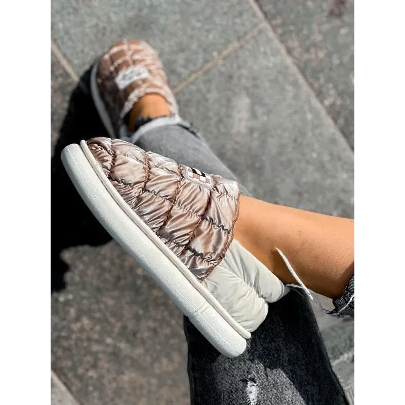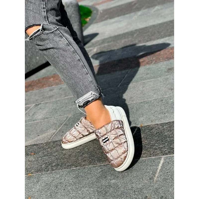 Стильні, легкі та неймовірно зручні короткі дутики-уггі кольору "кава з молоком". Ця модель — справжній хіт сезону, що поєднує комфорт домашніх капців та практичність вуличного взуття. Завдяки широкому розмірному ряду (від 36 до 45) модель чудово підійде як жінкам, так і підліткам або навіть чоловікам як акуратне змінне взуття. Верх виконаний з якісної стьобаної плащівки з ефектом металік (бронза), яка не боїться вологи та легко чиститься. Всередині — м'яке та густе еко-хутро, що забезпечує тепло та затишок. Завдяки низькій посадці та еластичному заднику взуття взувається за секунду без зайвих застібок (формат сліпонів). Потовщена підошва надійно ізолює стопу від холодної землі. Це ідеальний варіант для тих, хто багато часу проводить за кермом, або шукає максимально м'яке взуття для прогулянок. Характеристики: Сезон: Зима / Пізня осінь Матеріал верху: Водовідштовхувальна плащівка (нейлон) Матеріал підкладки: Густе штучне хутро (плюш) Колір: Кавовий / Бронза (Coffee) Підошва: ПВХ (потовщена, 2.5 см) Особливості: Широкий розмірний ряд, стиль «Автоледі» Країна виробник: Китай Розміри в наявності: 36, 37, 38, 39, 40, 41, 42, 43, 44, 45