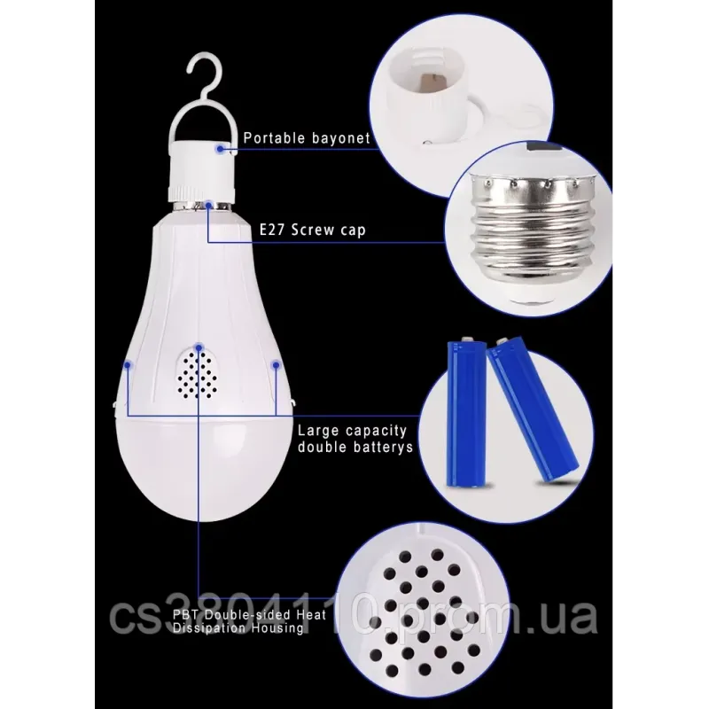 Вона має вбудований акумулятор 18650, який заряджається від мережі під час увімкнення в розетку Е27 і підтримує світло впродовж 3-5 годин у разі вимкнення електроенергії.