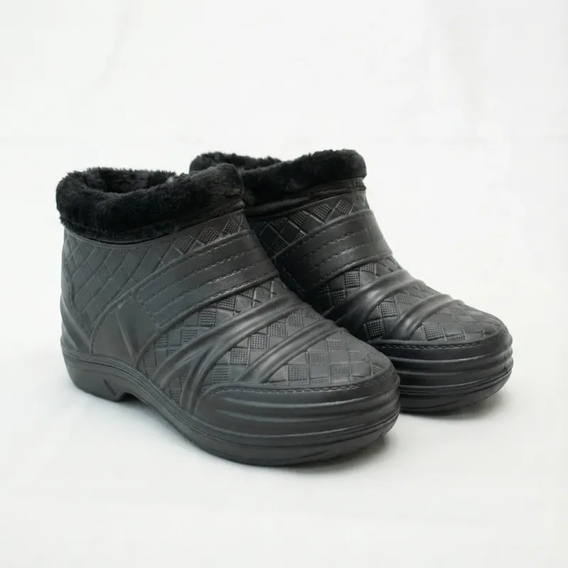 Легкі, теплі та абсолютно непромокаючі жіночі галоші з сучасного матеріалу ЕВА (піна). Це ідеальний вибір для сльотавої зими, бруду та мокрого снігу. На відміну від звичайної гуми, піна ЕВА має пористу структуру, тому вона чудово зберігає тепло і практично не відчувається на нозі завдяки своїй невагомості. Верх моделі має стильний рельєфний дизайн, що імітує стьобану шкіру, тому вони виглядають охайніше, ніж звичайні калоші. Всередині взуття утеплене густим штучним хутром чорного кольору, яке виступає назовні у вигляді акуратної опушки, захищаючи ногу від холоду. Суцільнолита конструкція без швів та блискавок гарантує 100% захист від протікання. Це взуття просто незамінне для приватного будинку, роботи на городі, прогулянок з собакою або походів у магазин у дощову погоду. Характеристики: Сезон: Зима / Холодна осінь / Весна (сльота) Матеріал верху: Піна ЕВА (EVA) — легка та морозостійка Матеріал підкладки: Штучне хутро (незнімне) Особливості: Водонепроникні, дуже легкі Колір: Чорний Країна виробник: Україна Розміри в наявності: 37, 38, 39, 40, 41