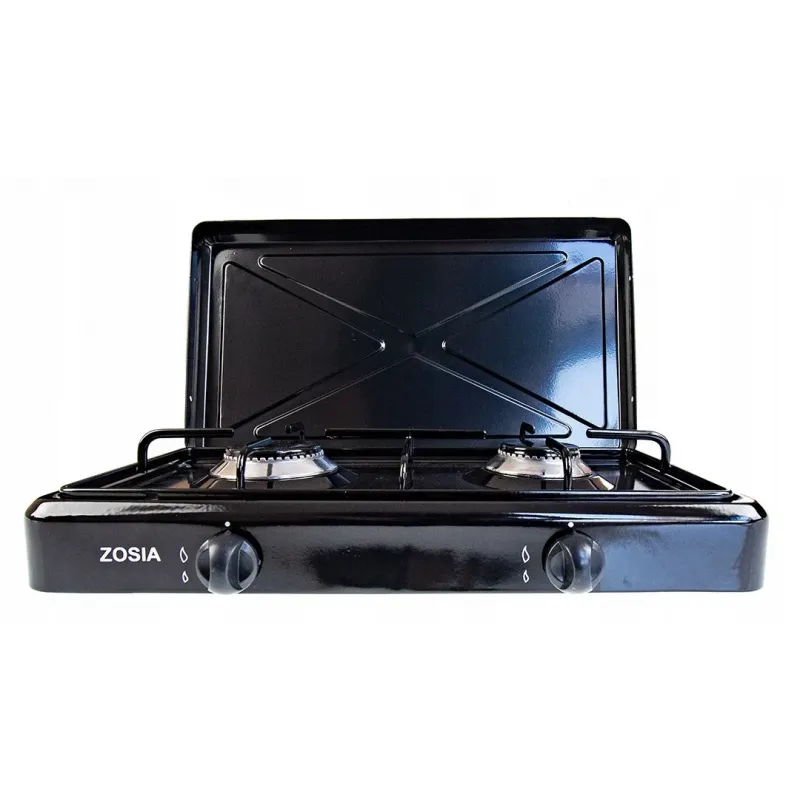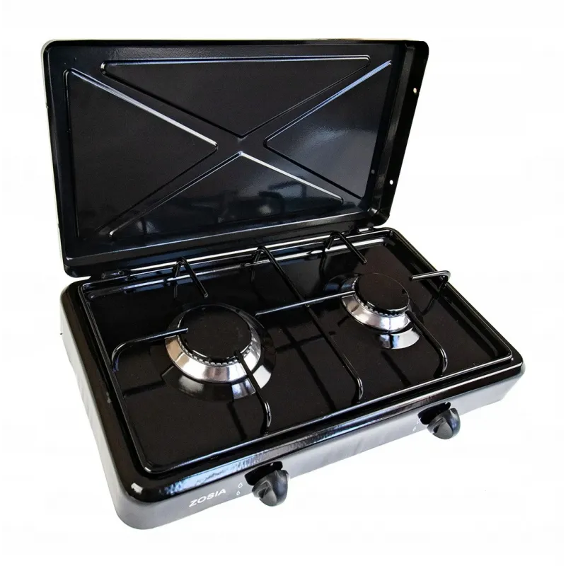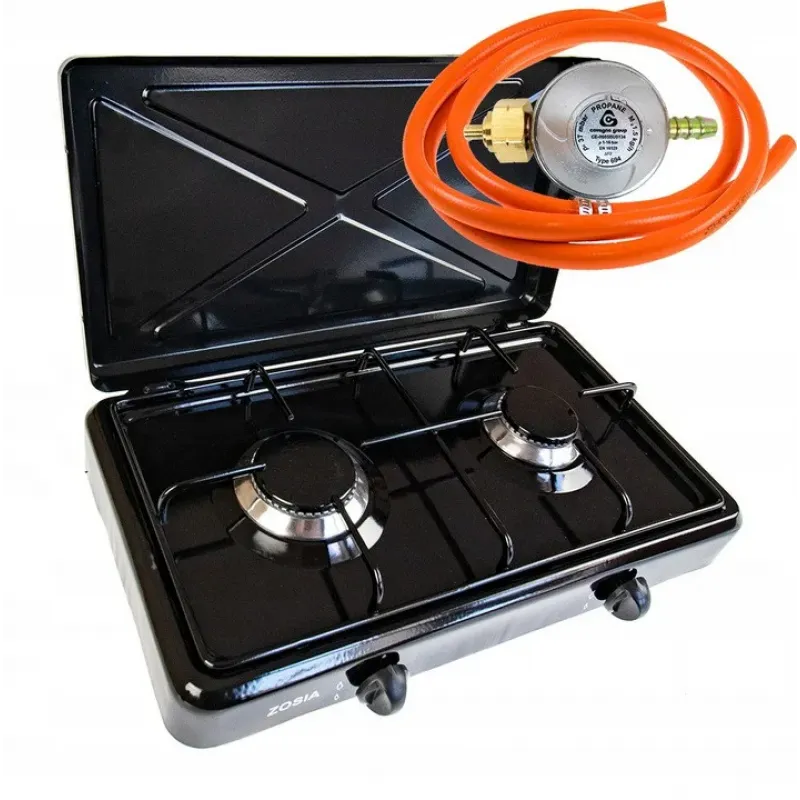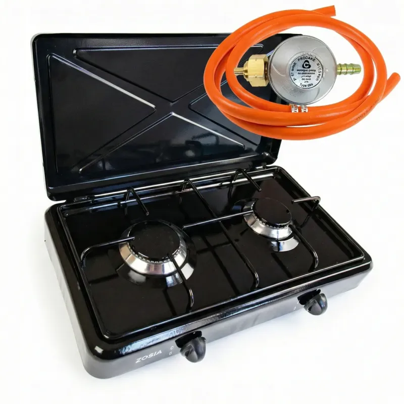 Газова плита настільна Zosia 2 конфорки (Чорна) + Комплект підключення (Шланг, Редуктор), таганок з кришкою
