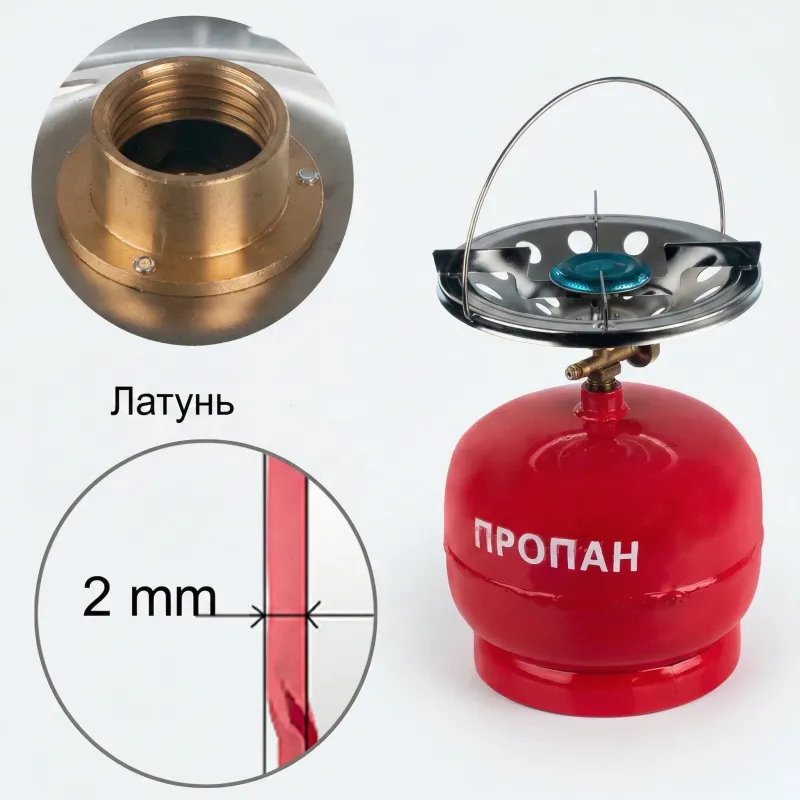 • Латунний пальник та кран: Кран-вентиль та основа конфорки виготовлені з латуні. Це забезпечує ідеальну герметичність з'єднань та відсутність витоків газу.