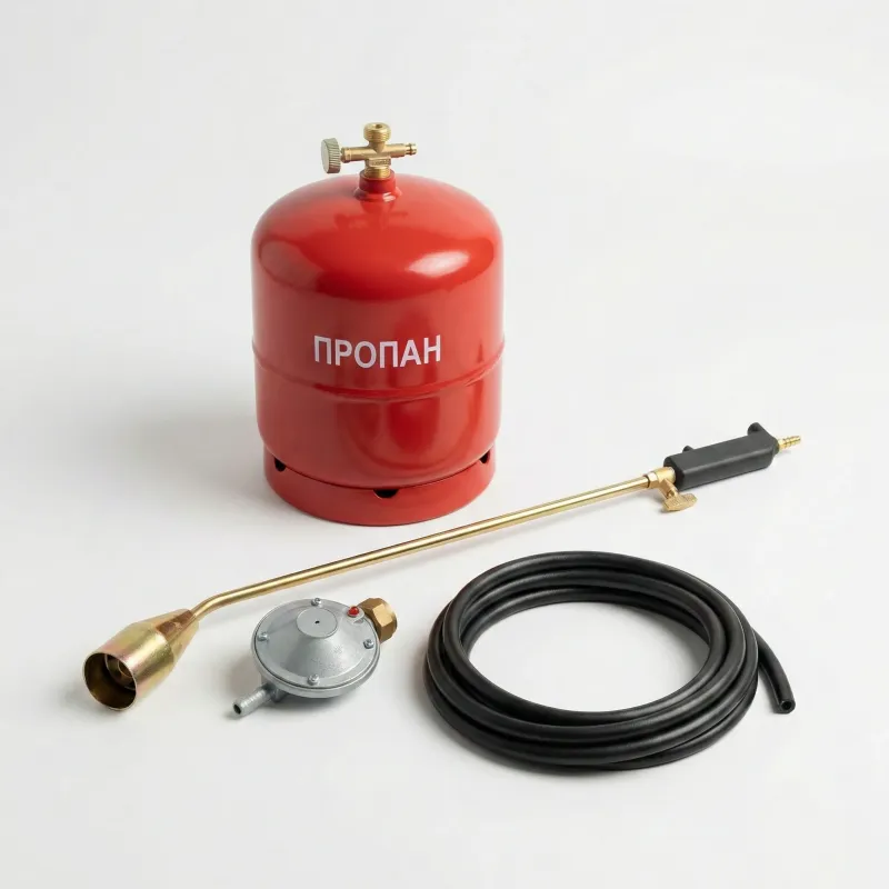 - Газовий балон 8 л (червоний): Багаторазовий, заправляється на АЗС. Об'єму вистачає на обробку кількох великих туш.