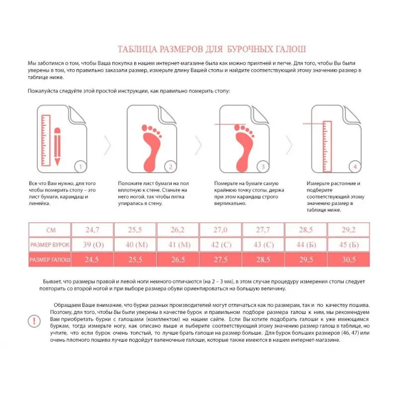 Калоші бурочні р. (36 - 47) чорні Калоші бурочні з ПВХ Бурочні калоші можна розглядати в якості прекрасного засоби захисту від морозної погоди, а також, коли на вулиці йде дощ. Цілком можна носити і без бурок, і в такому разі ця взуття збереже ваші ноги в сухості хоч в дощ, хоч в сніжну погоду. Бурочні калоші дуже легко очищаються від бруду і мають практичний чорний окрас. В основі продукту використовується полівінілхлорид, передбачена і текстильна прилитая підкладка. Підошва у даному випадку з рифленого ПВХ. Характеристики: Модель: калоші бурочні; Розміри: 25.5, 25.5, 26.5, 27.5, 28.5, 29.5, 30.5; (39-45) Виробник: Україна; Тип: литі; Підкладка: текстильна прилитая; Висота: 10 см; Матеріал: полівінілхлорид (ПВХ); Сезон носіння: круглий рік; Колір: чорний. Переваги: повністю непромокальні; легко надягають і знімаються. Розмір бурки 38 39 40 41 42 43 44 45 46 47 Маркування калоші 23,5 24,5 25,5 26,5 27,5 28,5 29,5 30,5 31 32 З усіх питань звертатися до менеджеру з продажу за номерами телефонів, зазначених на сайті онлайн-магазину «Штурман». Можна використовувати популярні месенджери Viber і WhattsApp.