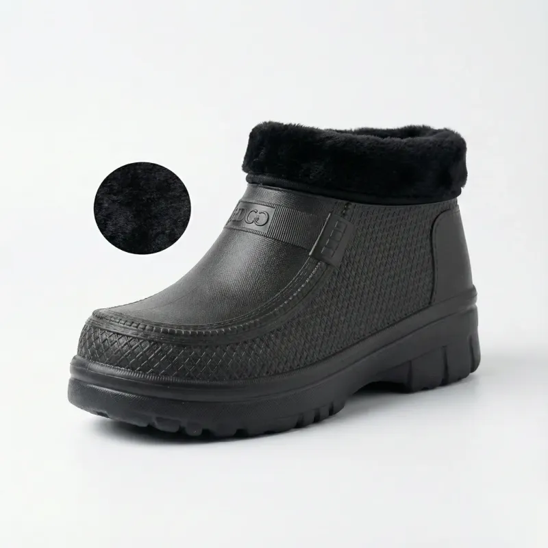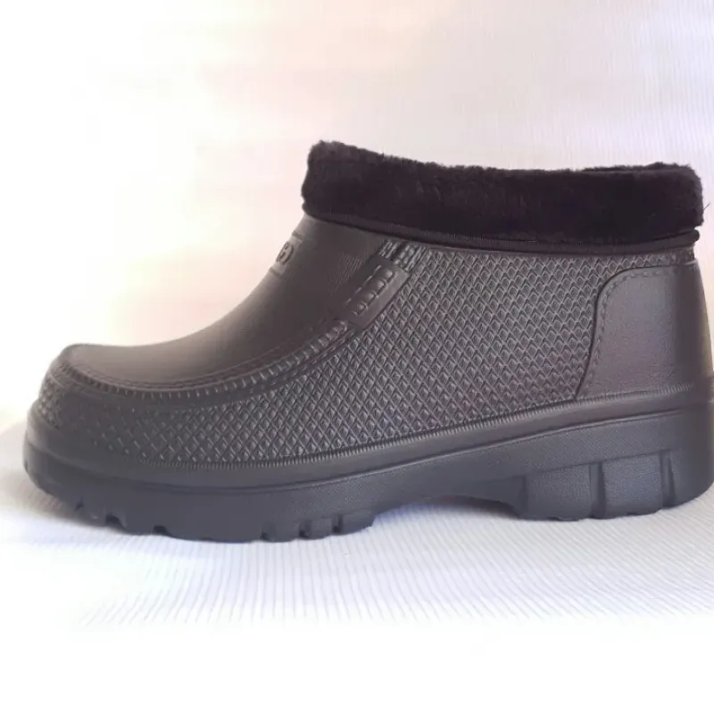 Чоловічі зимові напівчобітки з піни — ідеальний захист від сльоти та холоду! Ця модель поєднує в собі легкість домашніх капців та надійність вуличного взуття. Виготовлені із сучасного матеріалу EVA, вони не пропускають воду та зберігають тепло навіть у морозну погоду. Стильний дизайн із текстурним візерунком та хутряним відворотом дозволяє носити їх не тільки на дачі, а й у місті в дощову погоду. Чому варто обрати ці черевики: Легкість: Піна EVA в 4 рази легша за звичайну гуму, тому ноги не втомлюються навіть при тривалій ходьбі. Тепло: Всередині взуття утеплене густим штучним хутром чорного кольору, яке приємне на дотик і добре гріє. Практичність: Суцільнолита нижня частина гарантує 100% водонепроникність. Ідеально підходять для сльоти, мокрого снігу та бруду. Зручність: Коротка халява дозволяє швидко взуватися без зайвих зусиль (slip-on). Характеристики: Сезон: Осінь / Зима / Весна. Матеріал: Піна EVA. Утеплювач: Штучне хутро (незнімне). Колір: Чорний. Розміри: 41, 42, 43, 44, 45. 🥾 Замовляйте теплі чоловічі напівчобітки — тримайте ноги в сухості та теплі!