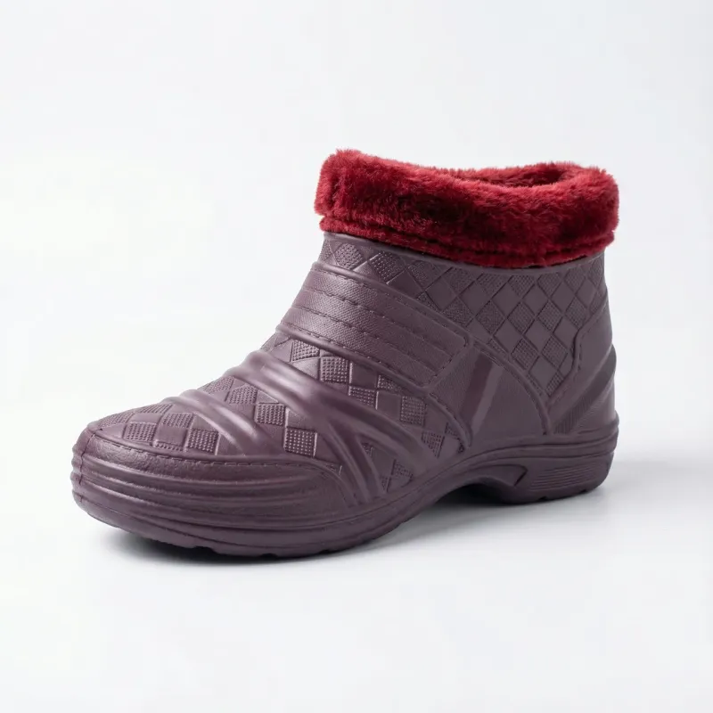 Жіночі утеплені калоші з піни — забудьте про мокрі ноги та холод! Ці легкі напівчобітки виготовлені із сучасного матеріалу EVA (пінка), який відрізняється неймовірною легкістю та відмінними термоізоляційними властивостями. У такому взутті ваші ноги завжди будуть сухими та теплими, навіть якщо на вулиці сльота чи мокрий сніг. Чому варто обрати цю модель: Невагомість: Матеріал EVA настільки легкий, що взуття майже не відчувається на нозі. Тепло: Всередині калоші утеплені м'яким хутром, а зверху прикрашені стильним хутряним відворотом бордового кольору, який захищає від задування вітру. Водонепроникність: Суцільнолита основа гарантує 100% захист від вологи. Дизайн: Гарний фіолетовий колір із рельєфним візерунком виглядає охайно та жіночно. Зручність: Легко взувати та знімати без зайвих застібок. Характеристики: Сезон: Осінь / Зима / Весна. Матеріал верху: Піна EVA (вологостійка). Утеплювач: Штучне хутро. Колір: Фіолетовий (Баклажан). Розміри: 38, 39, 40, 41, 42. ☔ Замовляйте теплі калоші з піни — комфорт для ваших ніжок у будь-яку погоду!