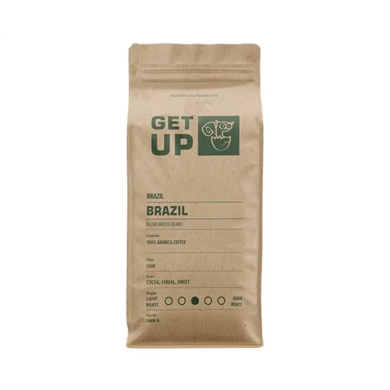 GetUp Brazil – це преміальна бразильська кава, виготовлена з добірних зерен 100% арабіки. Напій має м'який, насичений смак із нотами горіхів, шоколаду та карамелі, а середнє обсмаження підкреслює його природну солодкість і оксамитову текстуру.
