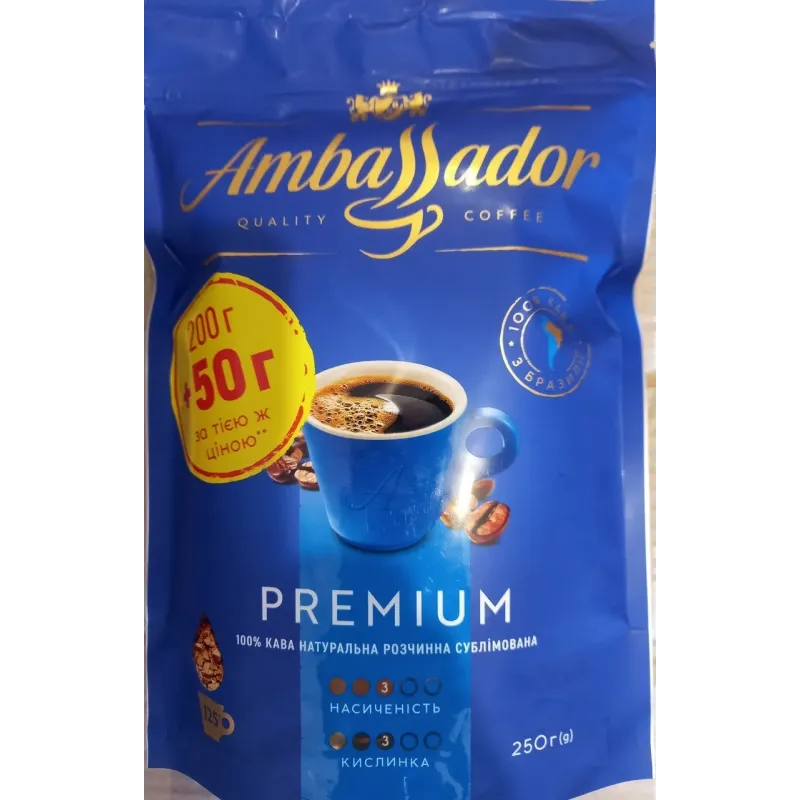 Кава розчинна Ambassador Premium 250 г (200+50 г) сублімована, Кава Амбассадор Преміум м'яка упаковка