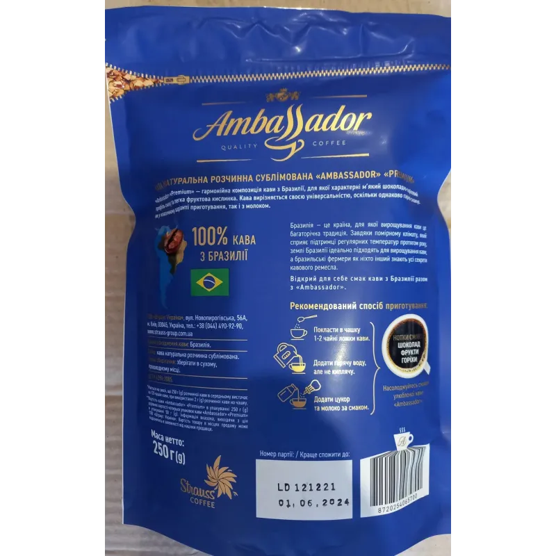 Розчинна кава Ambassador Premium — 100% бразильської якості у вашій чашці! Почніть ранок з аромату справжнього свята. Ambassador Premium — це гармонійне поєднання добірних зерен бразильської арабіки. Завдяки технології сублімації (freez-dried), кристали кави зберігають все багатство смаку та аромату свіжообсмажених зерен. Чому варто обрати цю каву: Вигідний формат: Спеціальна упаковка 250 г (200 г + 50 г у подарунок) — платите менше, насолоджуєтесь довше. Вишуканий смак: М'який, збалансований профіль з нотками шоколаду, фруктів та горіхів. Універсальність: Ідеально розкривається як у чорному вигляді, так і з додаванням молока або вершків. Зручна упаковка: Щільний пакет із застібкою (zip-lock) зберігає герметичність, захищаючи каву від вологи та вивітрювання. Характеристики: Тип: Розчинна, сублімована. Ступінь обсмаження: Середній. Смаковий профіль: Шоколад, горіхи, фрукти. Насиченість: 3 із 5. Кислинка: 3 із 5. Країна походження зерна: Бразилія 🇧🇷. ☕ Замовляйте Ambassador Premium просто зараз — подаруйте собі та близьким моменти справжньої насолоди!