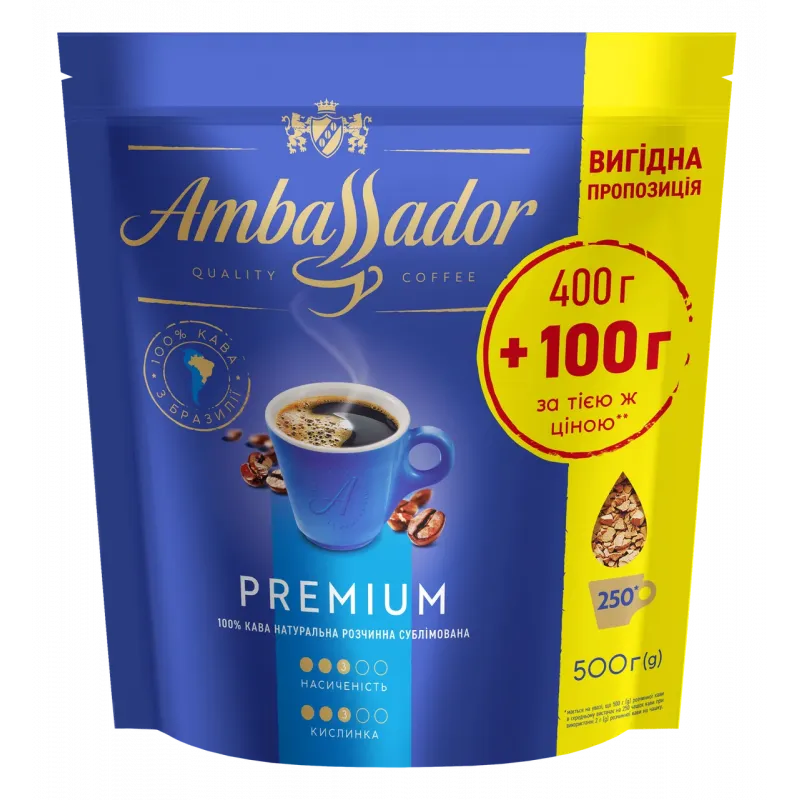 Кава розчинна Ambassador Premium 500 г (Акція 400+100) | Бразильська арабіка, Сублімована, Економ-пакет