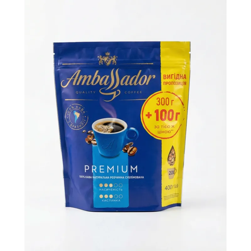 Зустрічайте акційну упаковку Ambassador Premium! Ви платите за 300 грамів, а отримуєте цілих 400 грамів відмінної розчинної кави. Це ідеальний формат для дому або невеликого офісу.