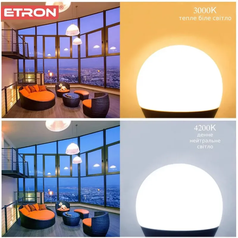 Лампи ETRON забезпечують комфортне освітлення, яке не мерехтить та не викликає втоми очей. Високий індекс кольору (Ra>80) гарантує природну передачу кольорів, а відсутність ультрафіолетового випромінювання робить світло безпечним для здоров'я.