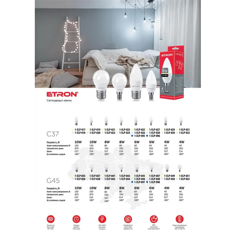 Універсальність: Лампи мають стандартний цоколь E14 і форм-фактор G45, що забезпечує простоту монтажу і сумісність з різними типами світильників.